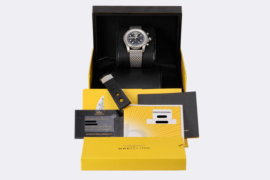 The Breitling Chronospace A23360 is a bold, oversized chronograph designed for precision and durability. Crafted in Switzerland in 2013, it features a 46mm stainless steel case with a rotating bezel, sapphire crystal, and a solid case back. Powered by the automatic Breitling caliber 23 movement, it offers a 42-hour power reserve and is currently running at -7 seconds per day. This model is water resistant to 200m and comes fitted with a stainless steel bracelet, plus an additional rubber strap with deployment buckle for versatility. A true luxury sport watch built for adventure and performance.