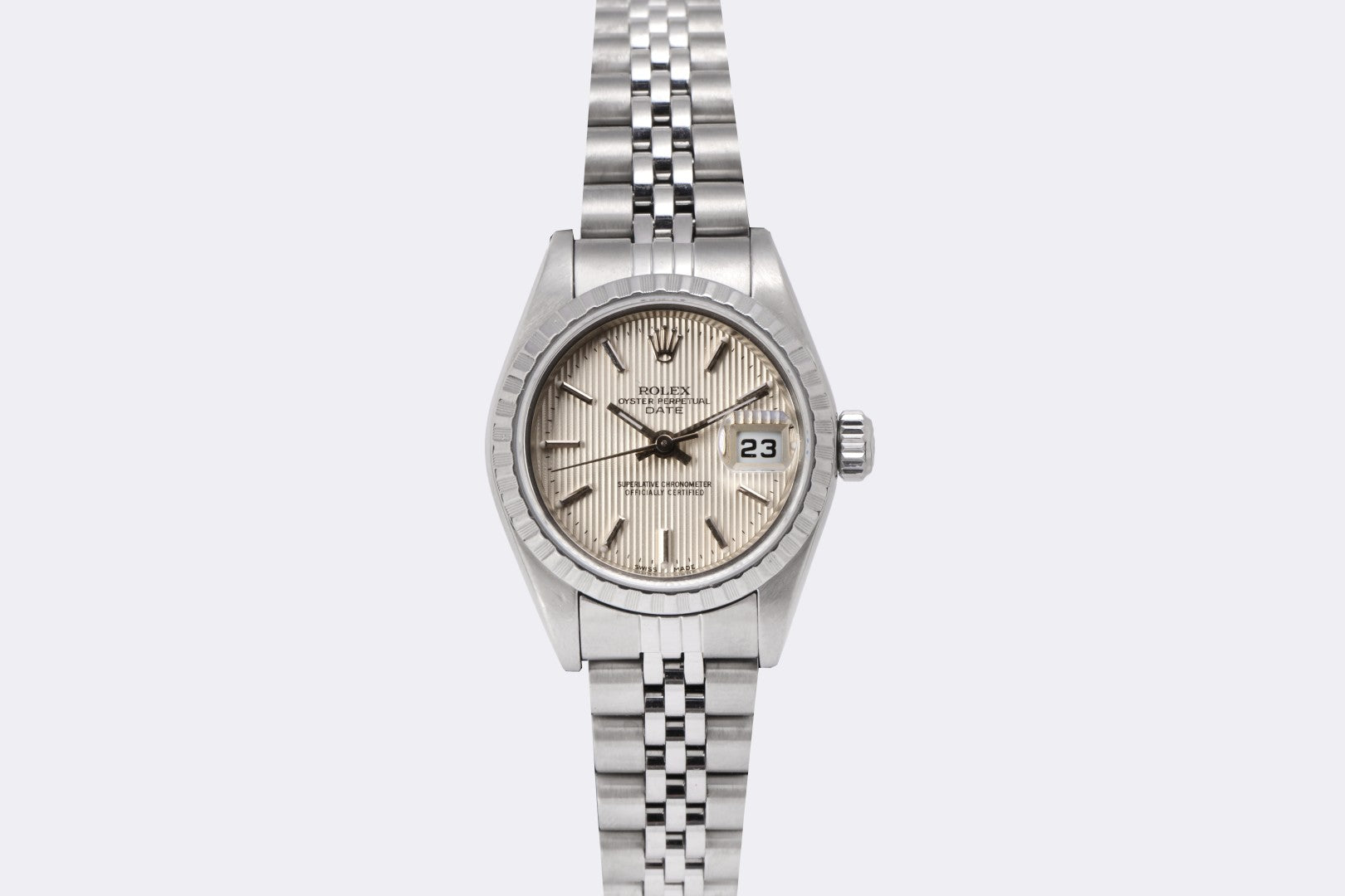 This elegant Rolex Oyster Perpetual Date 79240 stands out with its rare and highly desirable Tapestry dial—a vertically textured design that adds depth, dimension, and unmistakable vintage charm. Tapestry dials were discontinued years ago, making examples like this increasingly collectible, especially when paired with a classic all-steel Oyster Perpetual Date configuration.