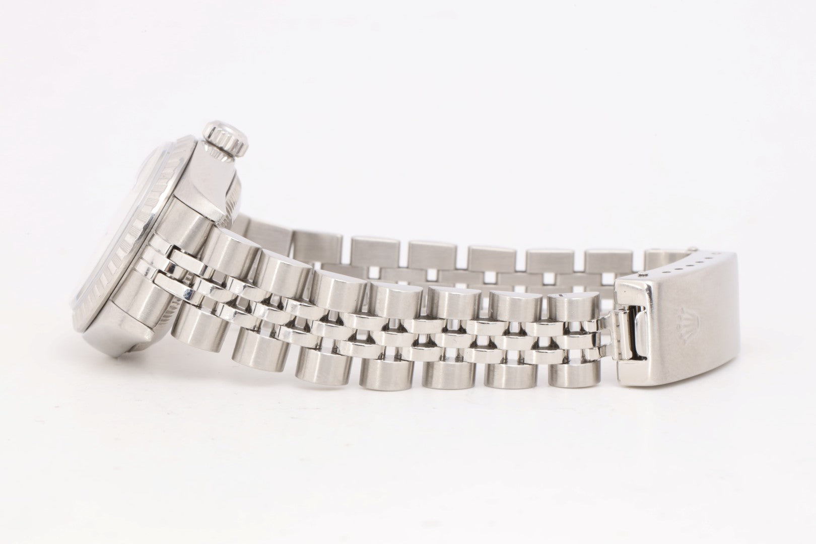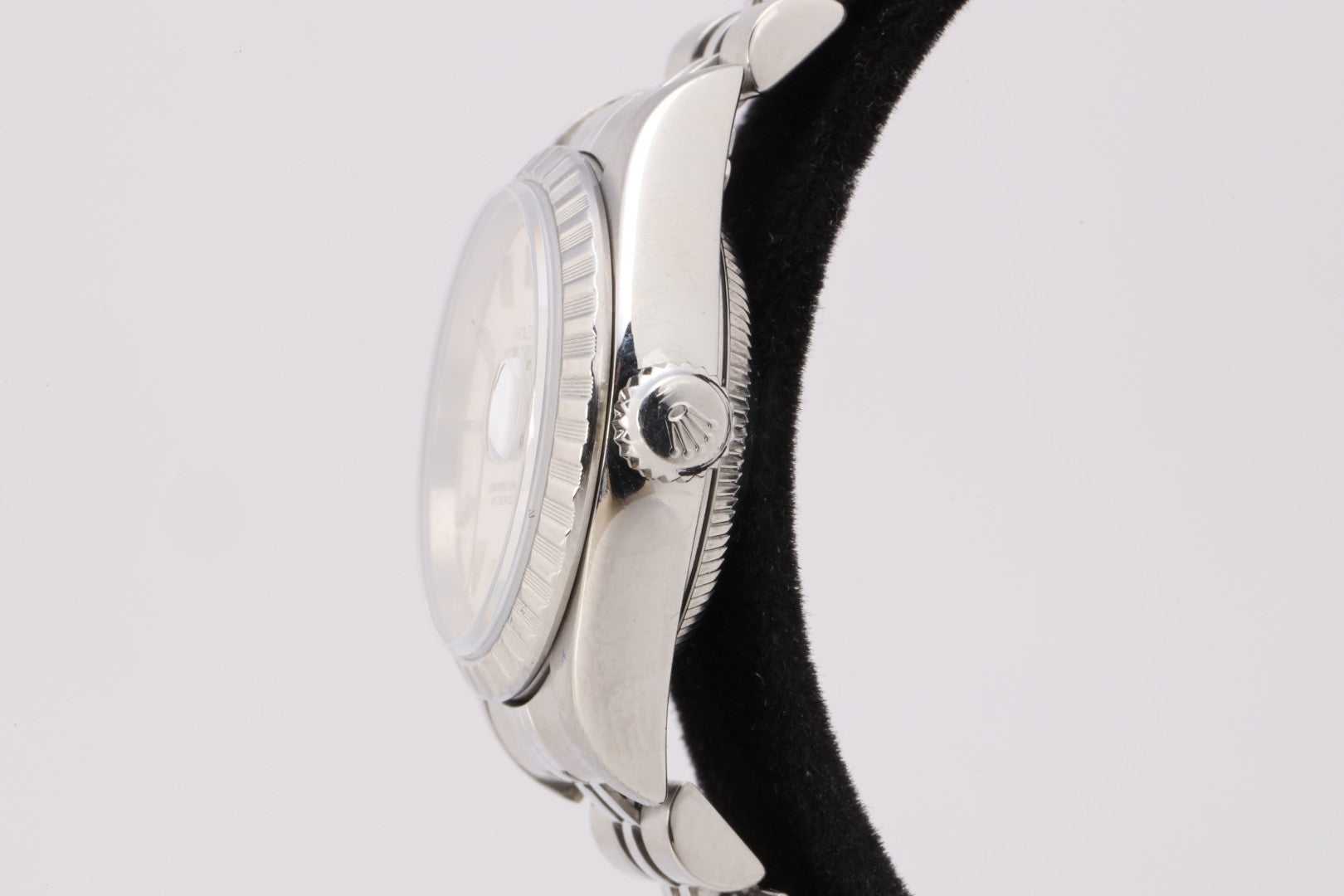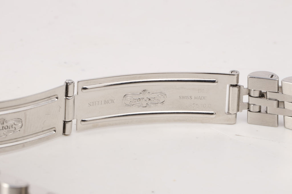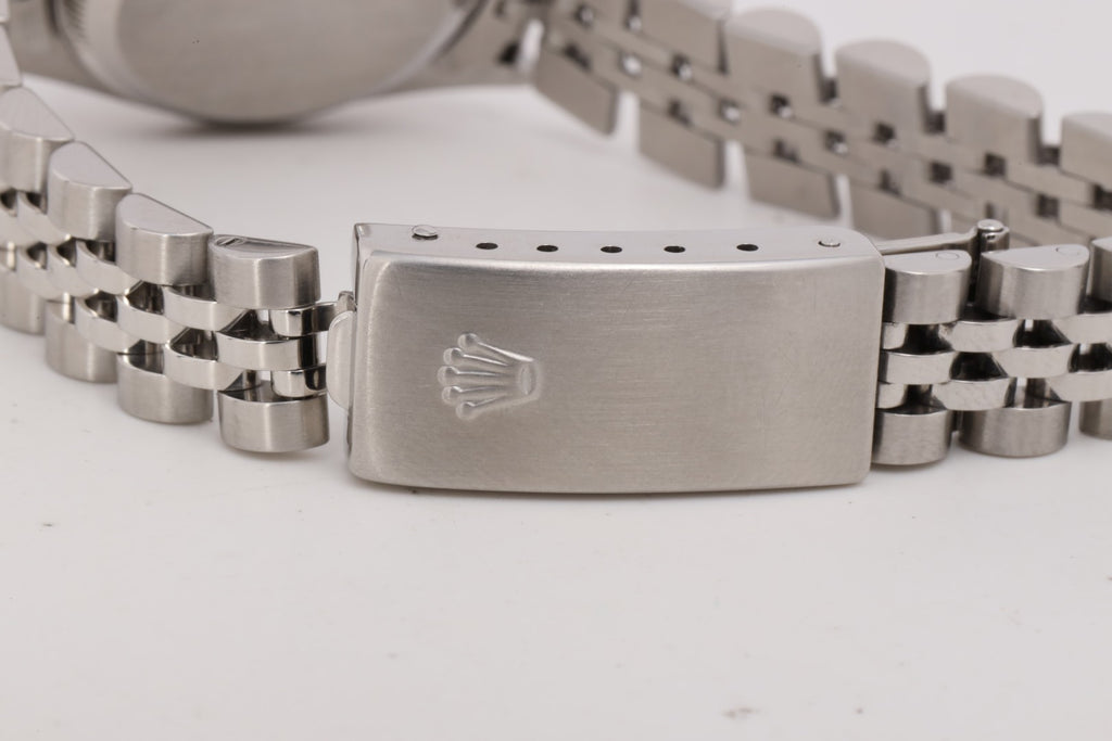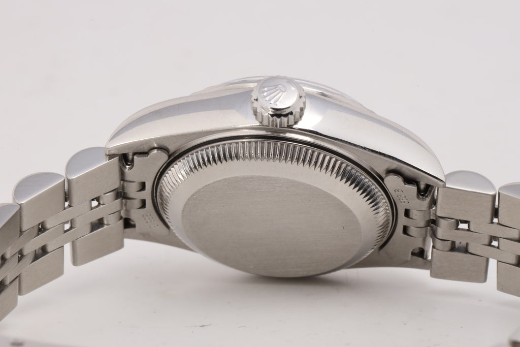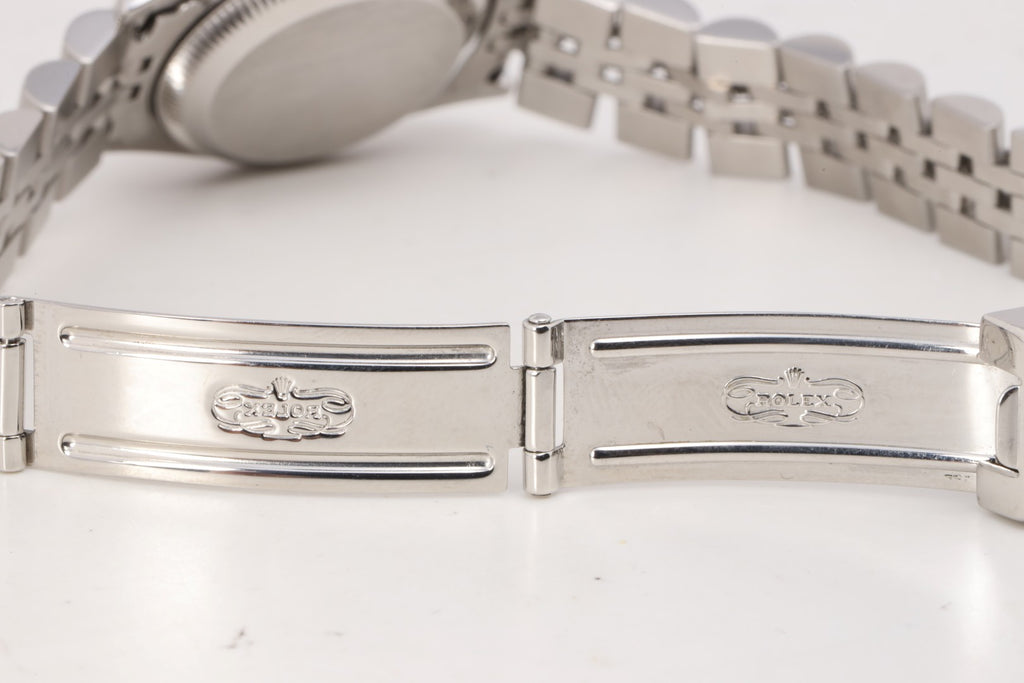 The 26mm stainless steel case and Jubilee bracelet create a refined silhouette, while Rolex’s dependable Caliber 2235 automatic movement delivers excellent performance at +2 seconds per day. With an overall condition rating of 7/10 and entirely original components, this is a beautiful opportunity to own a timeless ladies’ Rolex with a dial variation that seasoned collectors actively seek out.