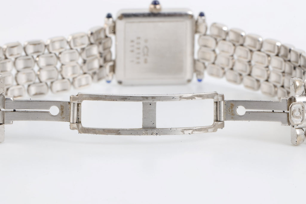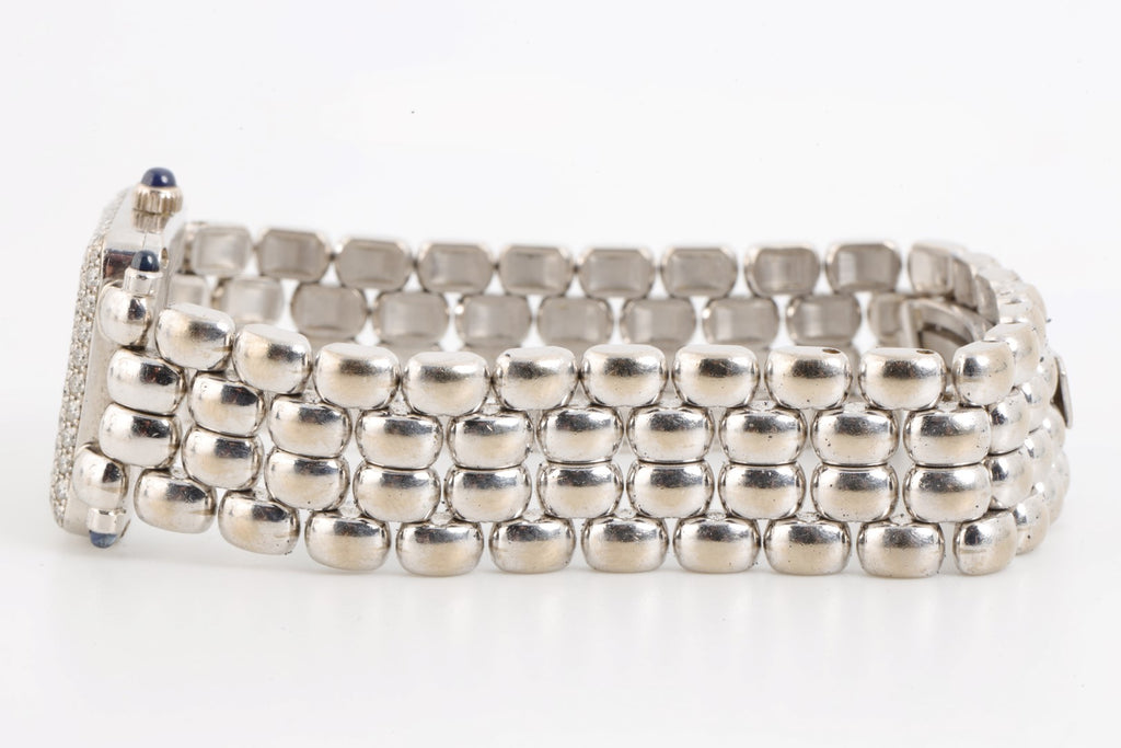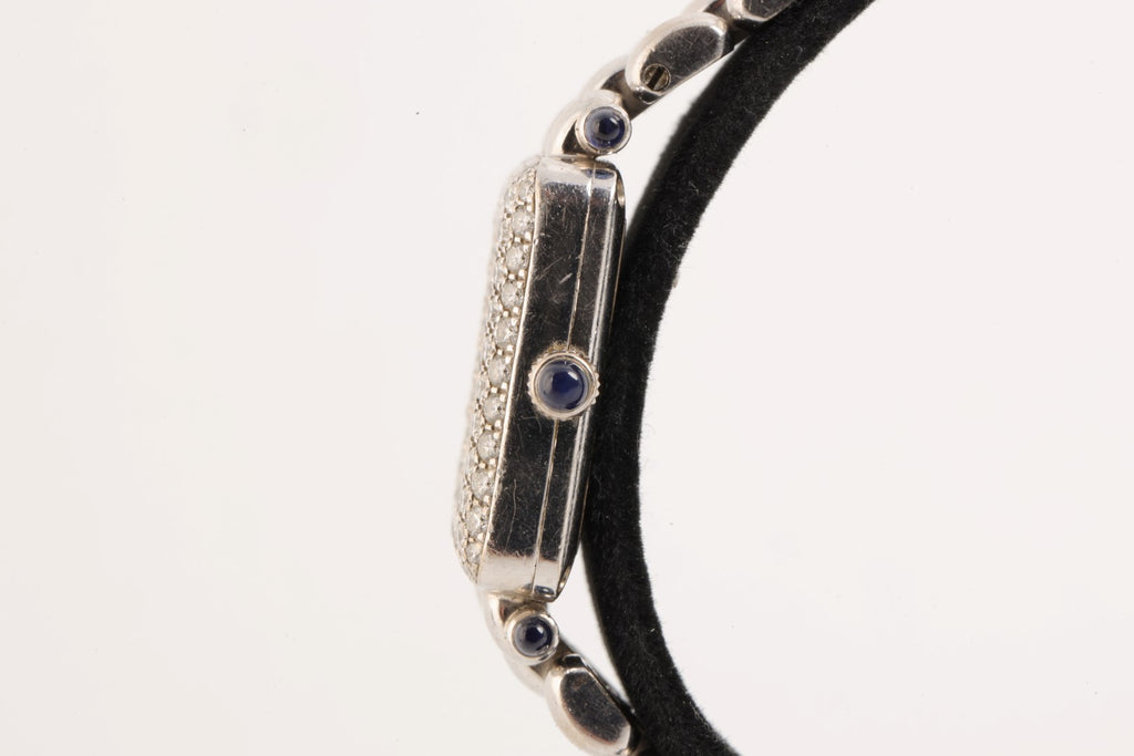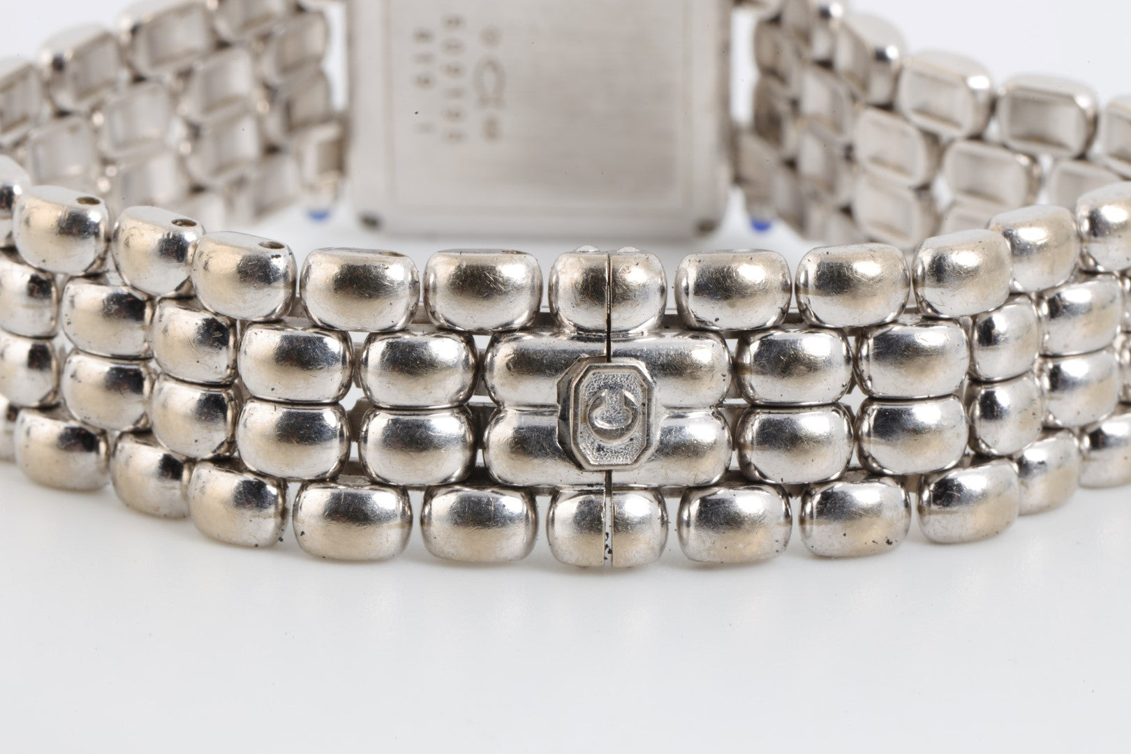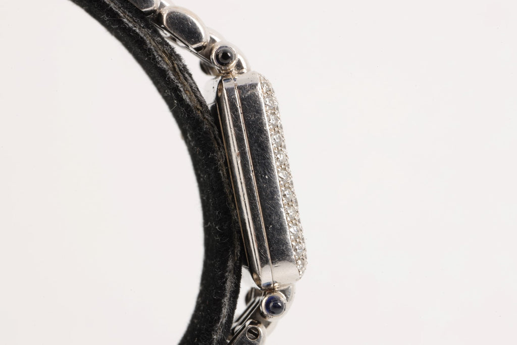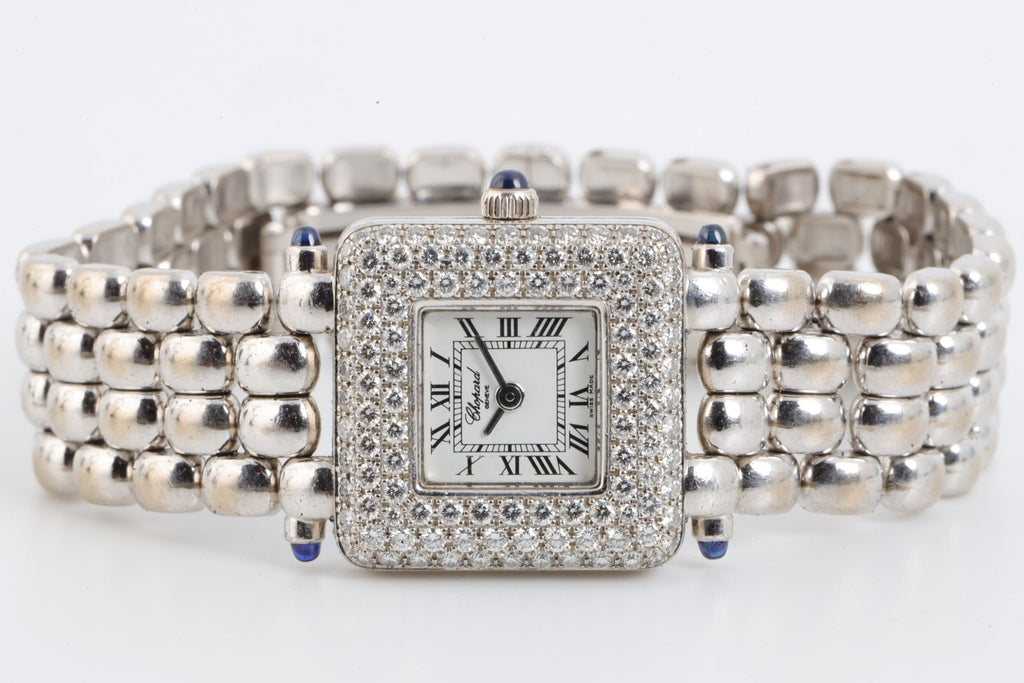The Chopard Happy Sport 419 is a refined ladies’ timepiece that combines playful elegance with Swiss luxury craftsmanship. Crafted in 18k white gold, this 21mm square case is framed by a brilliant diamond bezel, adding sophistication and sparkle. Powered by a reliable quartz movement and protected by a sapphire crystal, this watch embodies both durability and grace. Its matching 18k white gold bracelet with butterfly clasp ensures a seamless, elegant fit on the wrist.