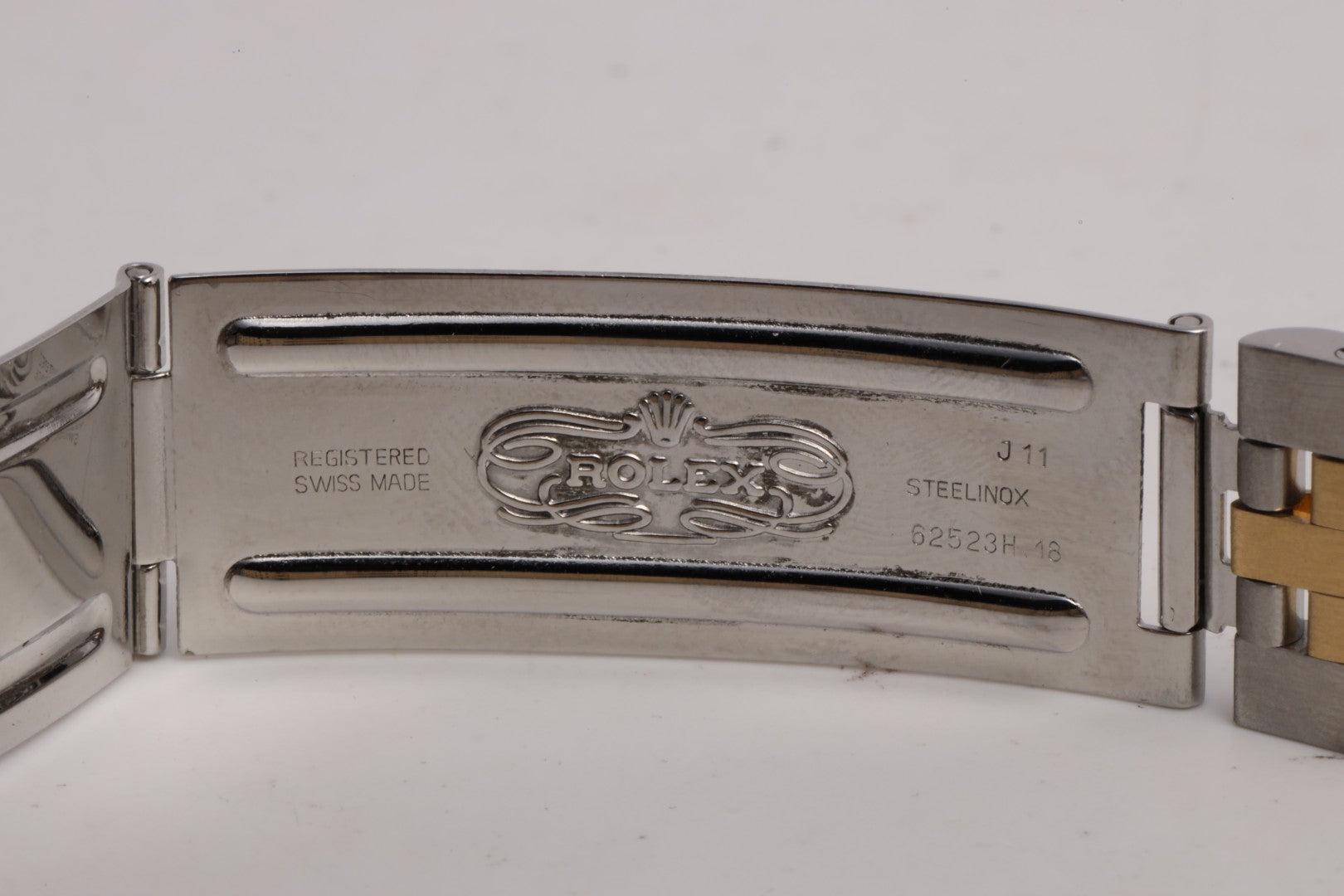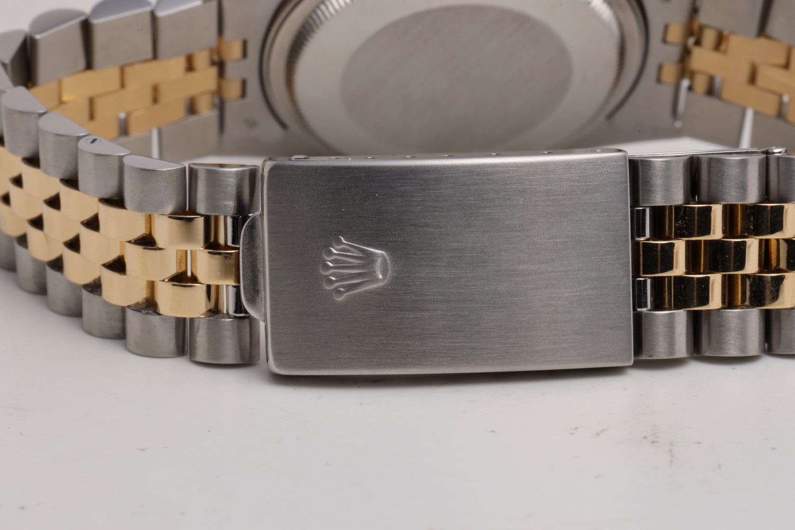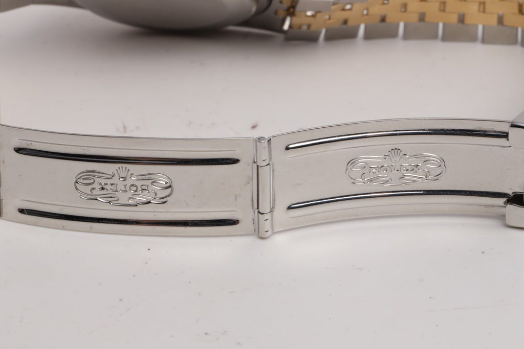 - Strap: Stainless Steel & 18k Yellow Gold Jubilee Bracelet, 7.75" Max Wrist Size, Fold Clasp (5 Screws)