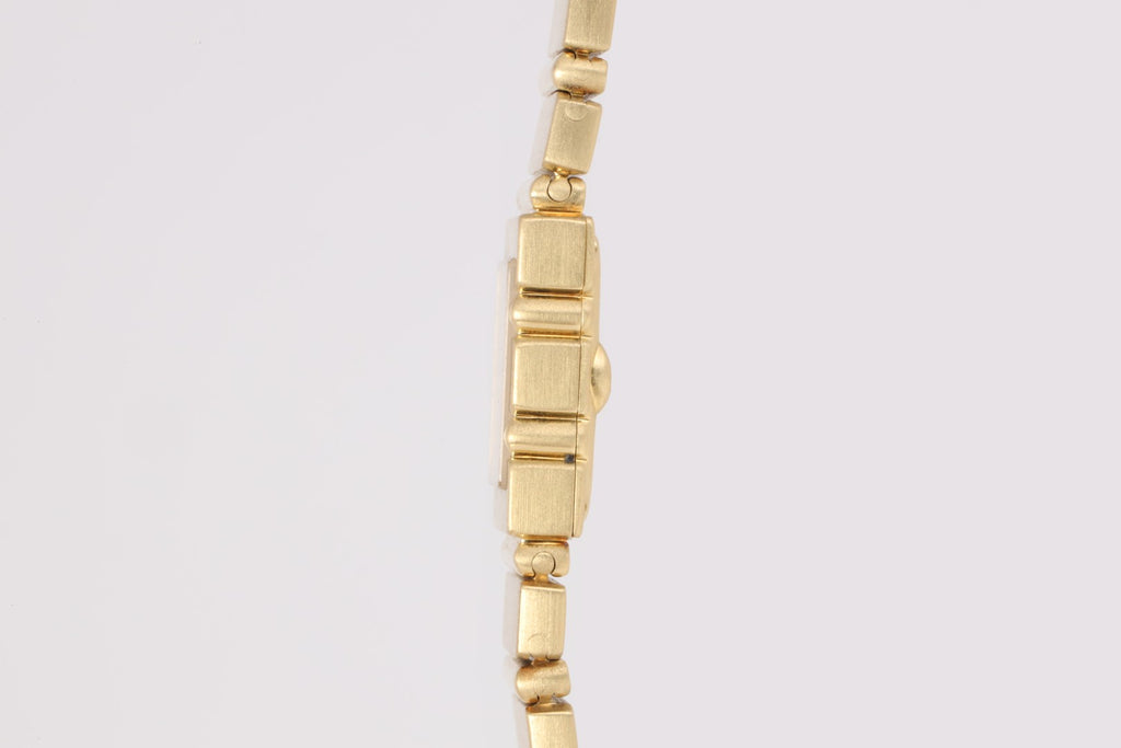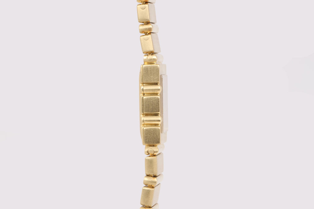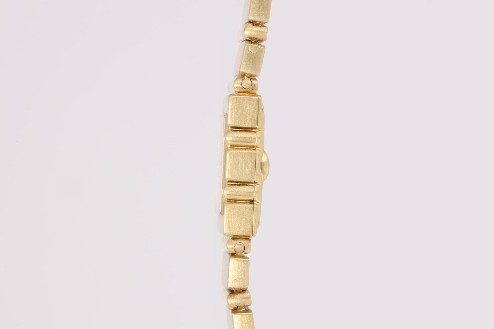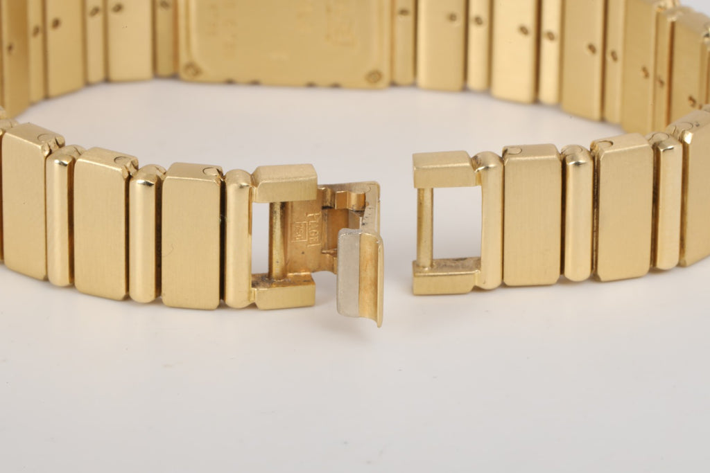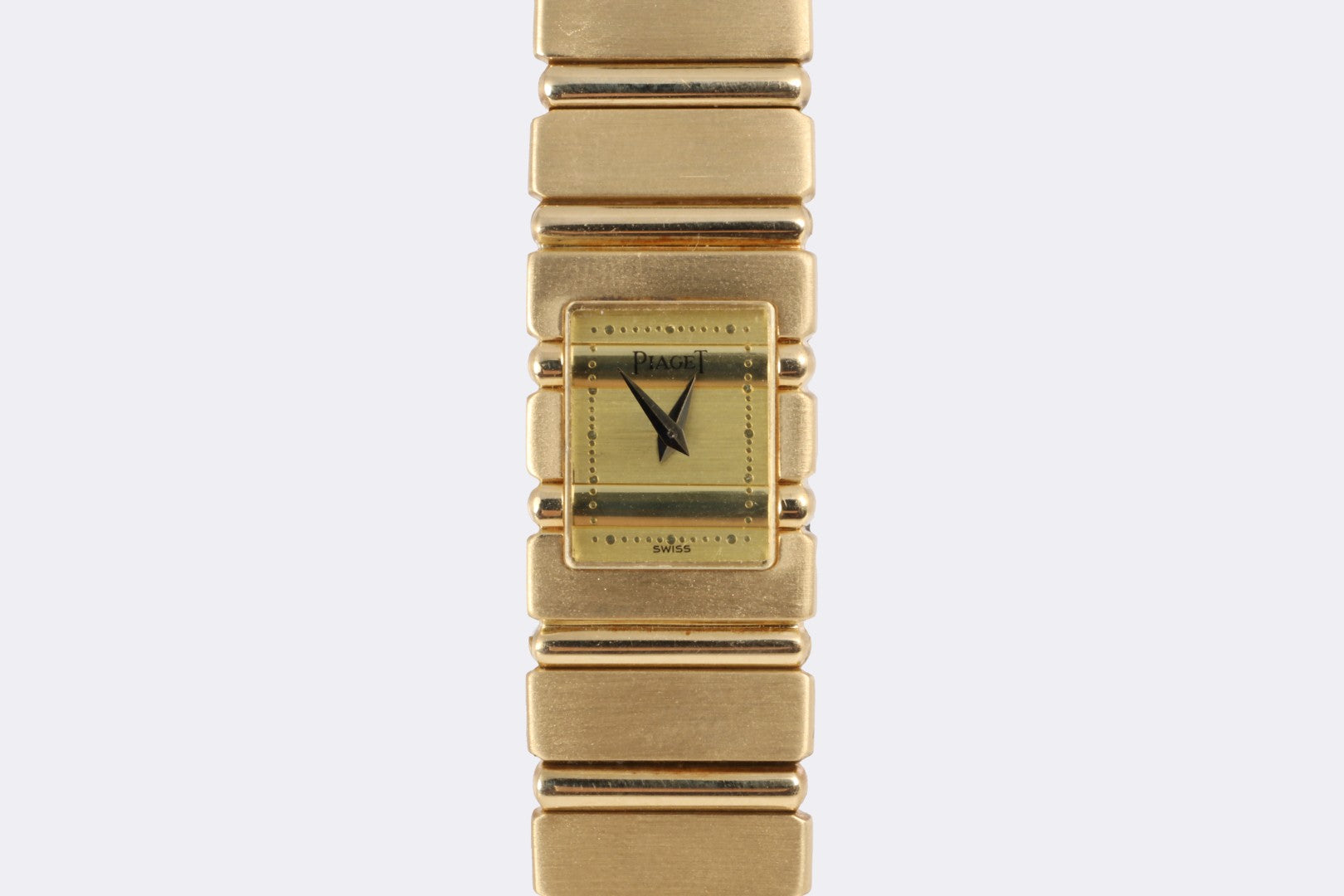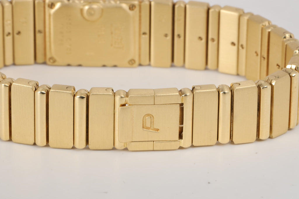 The Piaget Polo 15201 C701 is a sleek and elegant ladies' timepiece that exemplifies refined luxury. Crafted in Switzerland, this 14mm watch features a rectangular case and integrated bracelet in 18k yellow gold, offering a seamless and sophisticated profile. Powered by a quartz movement, it delivers reliable hour and minute functions. With a maximum wrist size of 6.25", this watch is both graceful and substantial, weighing 80.94 grams.