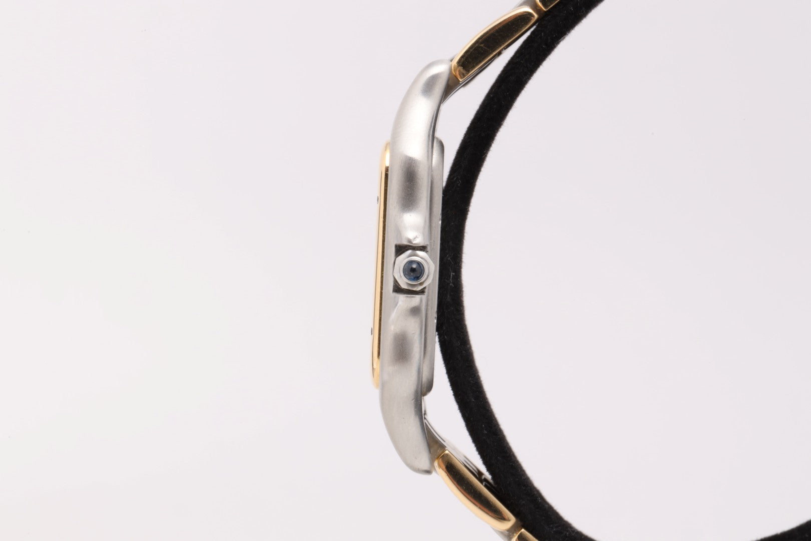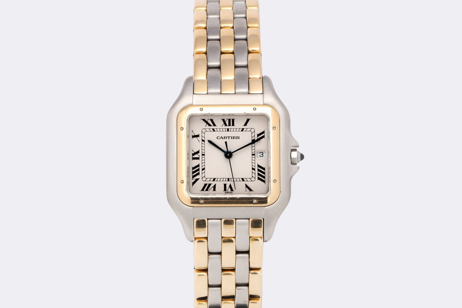 An enduring symbol of French elegance, the Cartier Panthère stands among the most recognizable and refined timepieces ever made. This Jumbo 3-Row reference 187957 blends stainless steel and 18k yellow gold in perfect harmony, showcasing Cartier’s mastery of proportion and timeless design. The square bezel, blue cabochon crown, and seamless link bracelet make this model both unmistakably Cartier and effortlessly wearable — a watch that transitions gracefully from casual chic to evening sophistication.