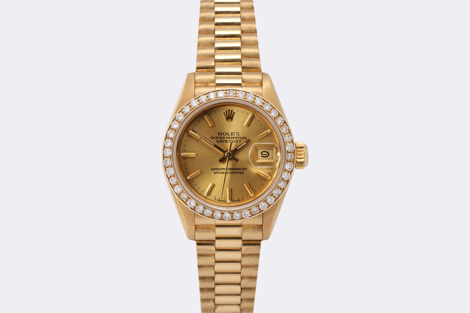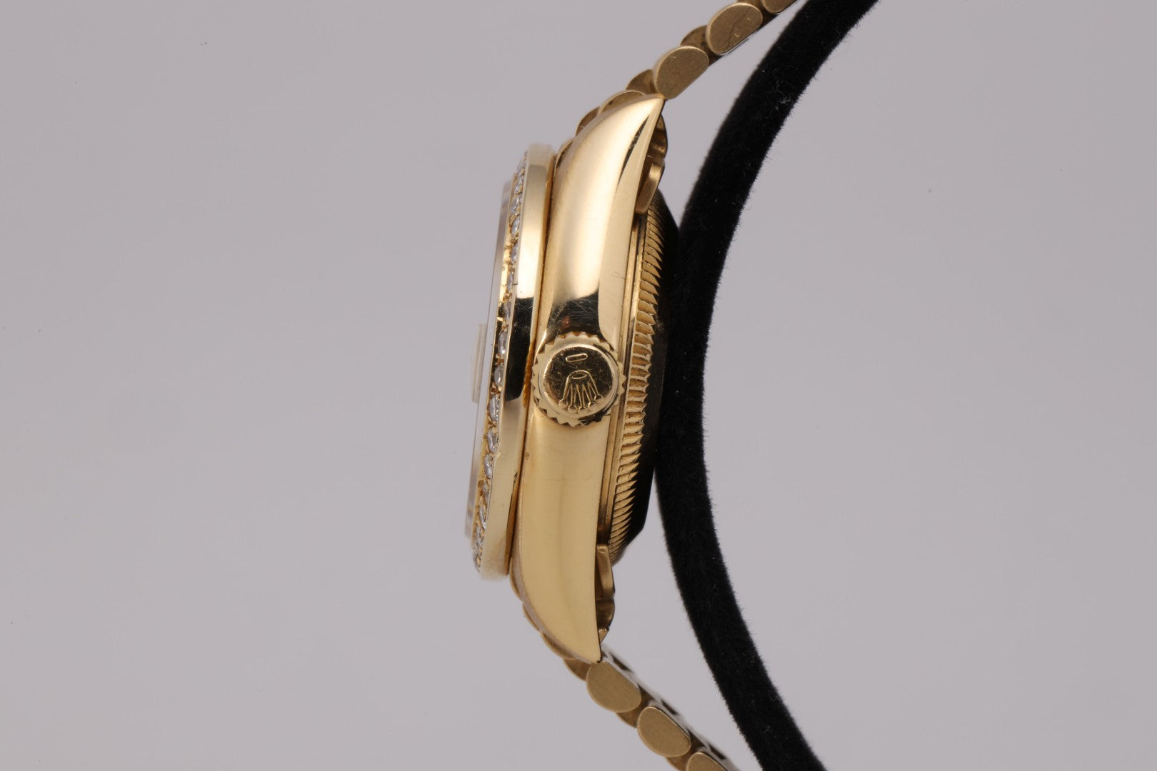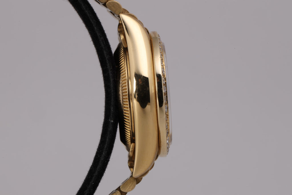 This example showcases its rich gold tone beautifully, paired with an aftermarket diamond bezel that adds extra sparkle without overpowering the classic Rolex aesthetic. The watch remains in strong condition overall (8/10), with normal wear consistent with age and a sapphire crystal showing a few minor marks. The automatic Caliber 2135—renowned for precision and reliability—has been fully inspected by our watchmaker and is running well at +15 seconds per day.