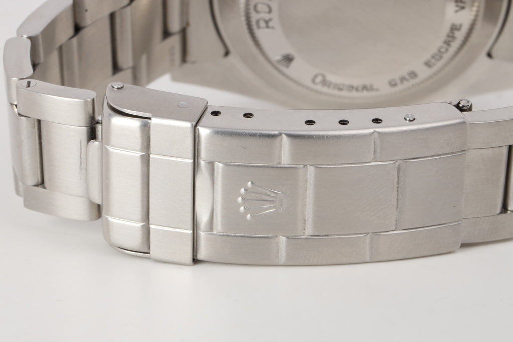 This 1991 Rolex Sea-Dweller 16600 is a true tool watch icon, built for professional diving with water resistance up to 4000ft. Its 40mm stainless steel case and Oyster bracelet embody classic Rolex durability, while the dial has developed an amazing patina that makes this piece especially desirable among collectors. Powered by the automatic Rolex caliber 3135 movement with a 48-hour power reserve, it is keeping time at +7 seconds per day. Recently serviced (8/7/2025) and pressure tested, this Sea-Dweller is a reliable and collectible addition to any serious collection.