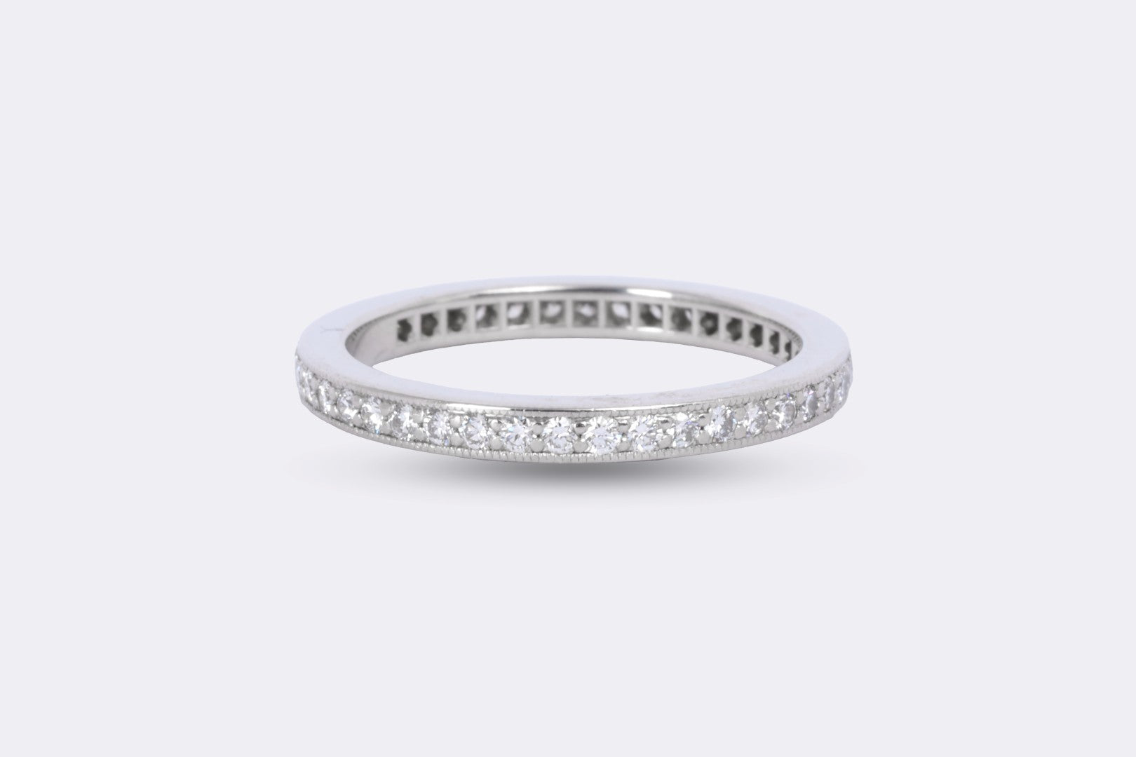 Elevate your jewelry collection with this exquisite Tiffany & Co. Legacy eternity band, a timeless symbol of sophistication and enduring love. Expertly crafted in luxurious PT950 platinum and stamped “Tiffany & Co.”, this premium designer ring showcases forty-two round brilliant diamonds totaling approximately 0.42 carats. Each stone is meticulously matched for G–H color and VVS1–VVS2 clarity, creating an unbroken circle of brilliance that catches the light from every angle. Measuring 2.25mm wide, this size 7 band is the perfect choice for a wedding ring, anniversary band, or an elegant stackable statement piece. Original approximate retail: $3,750.