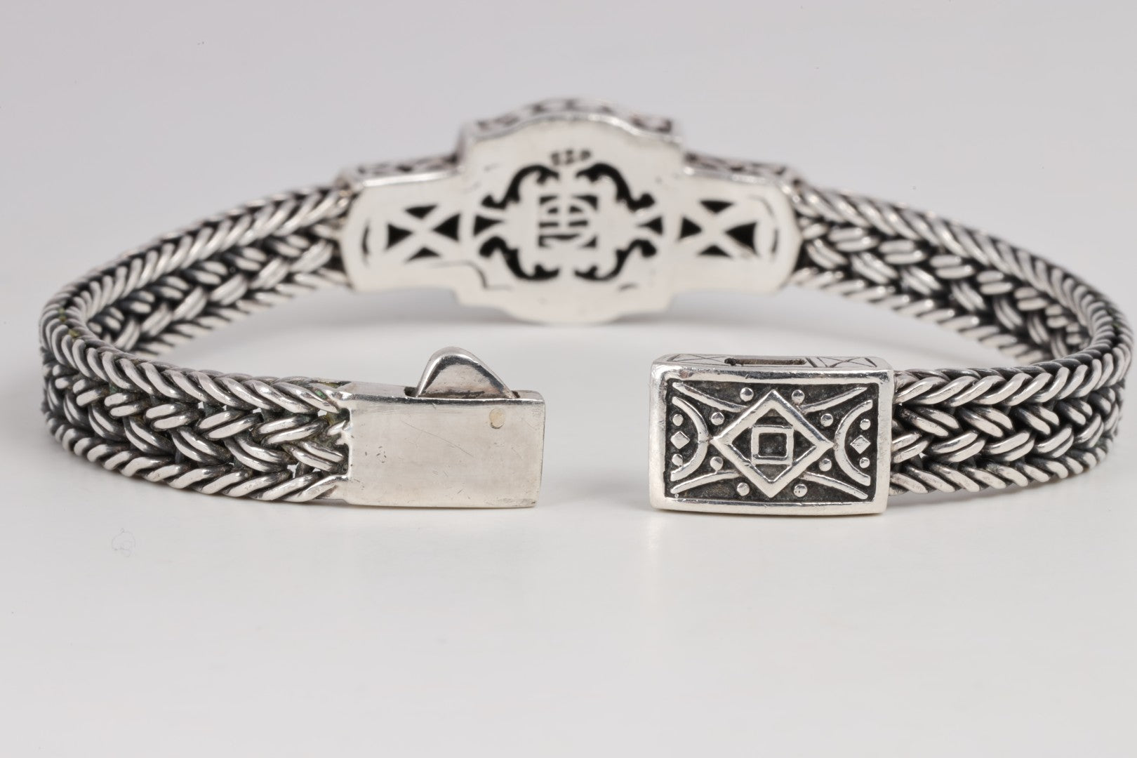 This John Hardy Dragon Weave bracelet embodies the brand’s signature craftsmanship with its intricate woven sterling silver links and bold turquoise cabochon clasp. The push clasp is adorned with a green-blue stone, adding a vibrant pop of color to the design. Strong yet flexible, this bracelet is both a luxurious accessory and a wearable work of art.