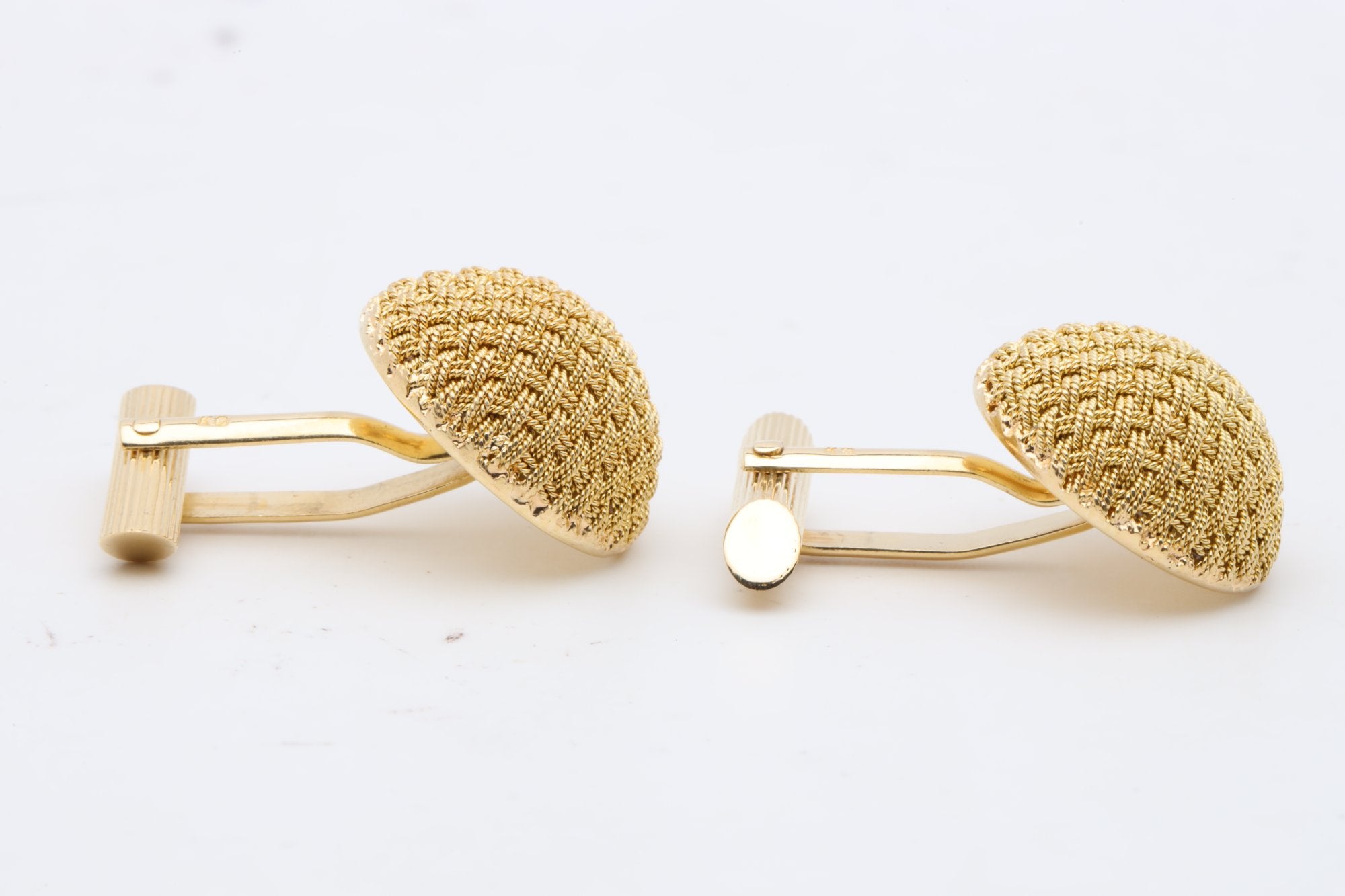 These cuff links are a testament to timeless elegance, crafted from yellow gold. The domed woven design adds a touch of sophistication, making them a perfect accessory for any formal occasion.