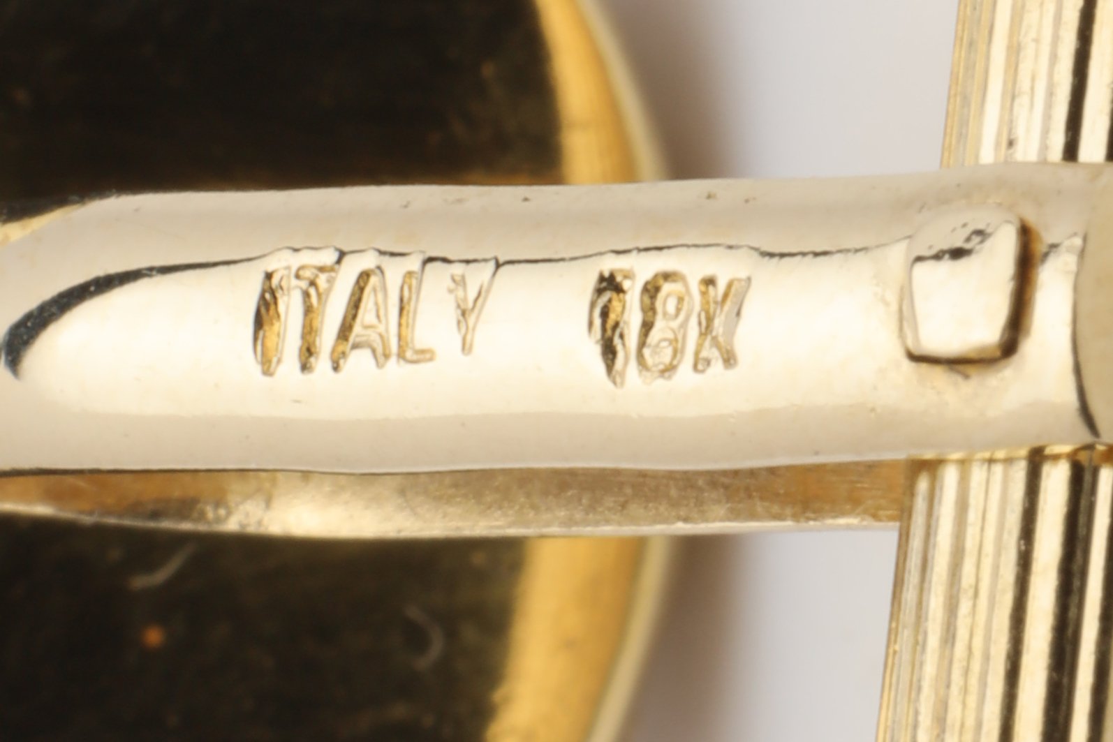 The cuff links feature a bullet back clasp for secure and easy fastening. They are engraved with 'ITALY' and 'KG', adding a unique touch to these exquisite pieces.