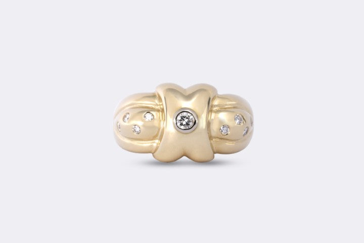 Bold and substantial, this 14k yellow cocktail ring features a striking layout of nine round brilliant diamonds totaling 0.29 carats. Weighing 11.47 grams and designed in a size 8.25, it's a standout piece with confident presence and timeless appeal. Approximate retail: $2,000.