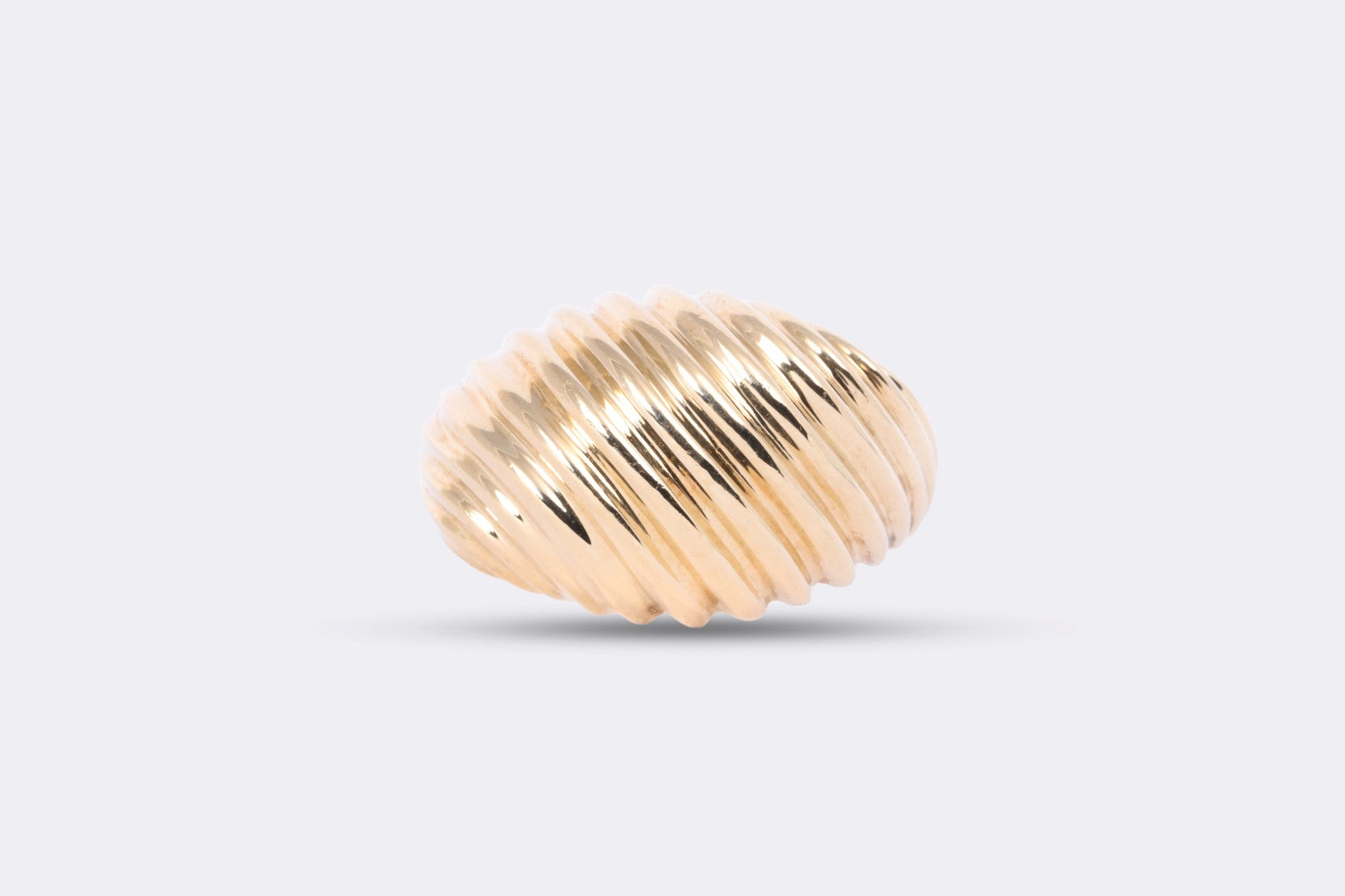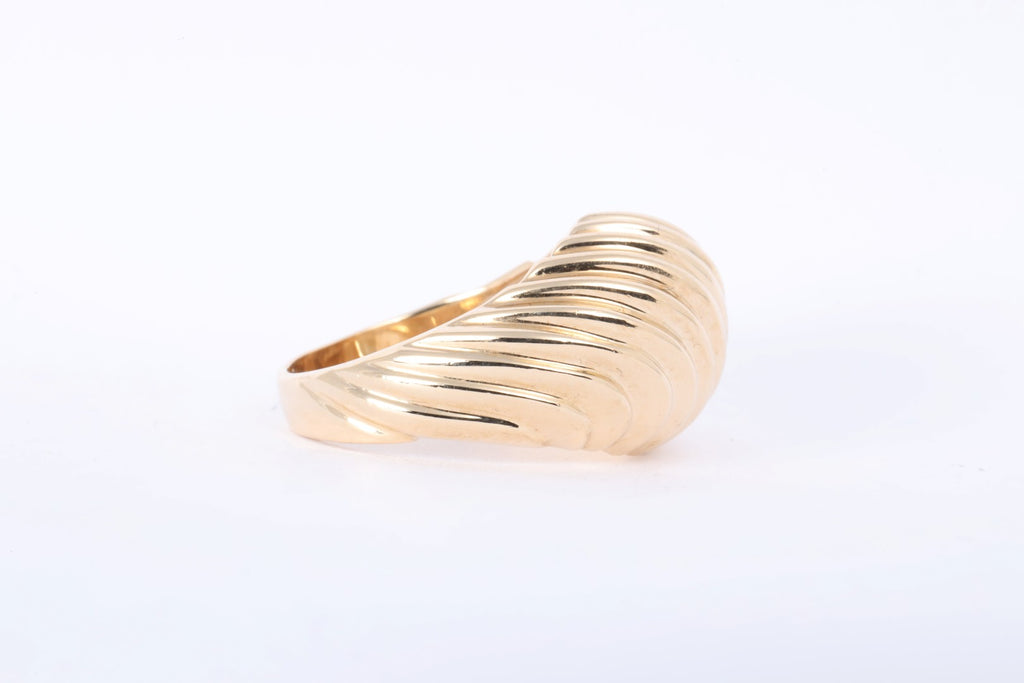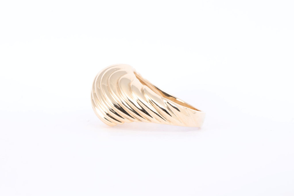 Bold and stylish, this shrimp design dome ring is crafted in 14k yellow gold with a sculptural ribbed texture that makes a statement on the hand. Weighing 12.72 grams, it has a substantial presence while maintaining elegant curves and balance. At size 8, this ring is perfect as a standout piece on its own or paired with other gold jewelry for a chic, layered look. A timeless design that combines vintage charm with modern sophistication.