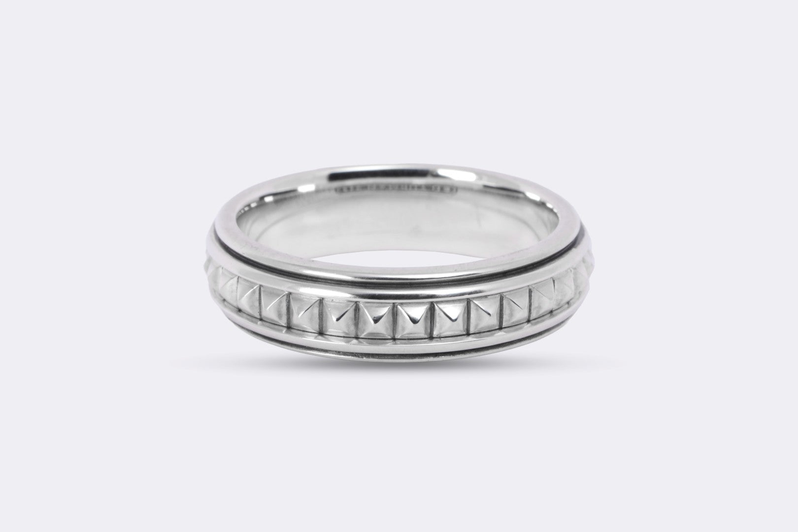 Masculine and modern, this David Yurman men’s pyramid band ring embodies the brand’s sculptural design language and impeccable craftsmanship. Crafted in sterling silver, the 6mm band features a bold pyramid motif—an architectural texture that catches the light with every movement while maintaining an understated edge.
