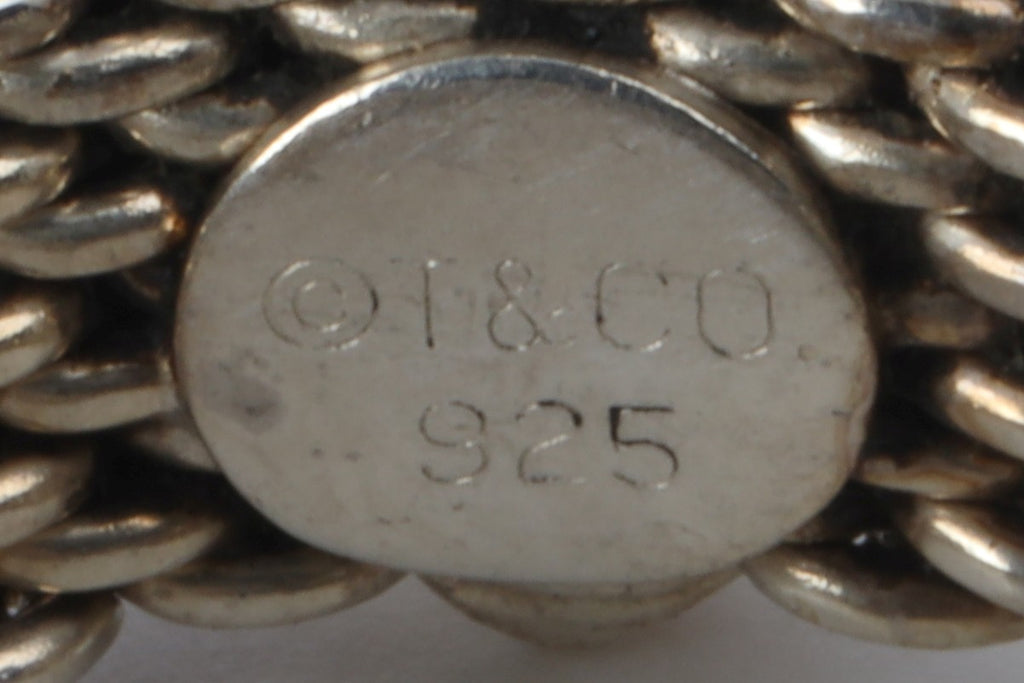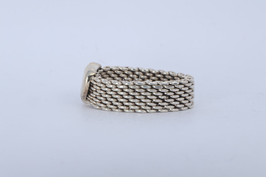 This elegant Tiffany & Co. Somerset ring features the brand’s signature woven mesh design in sterling silver, accented by a polished heart detail. Lightweight yet durable, it’s a timeless expression of Tiffany’s understated sophistication—perfect for everyday wear or as a heartfelt gift. PM Number: PM4009393.