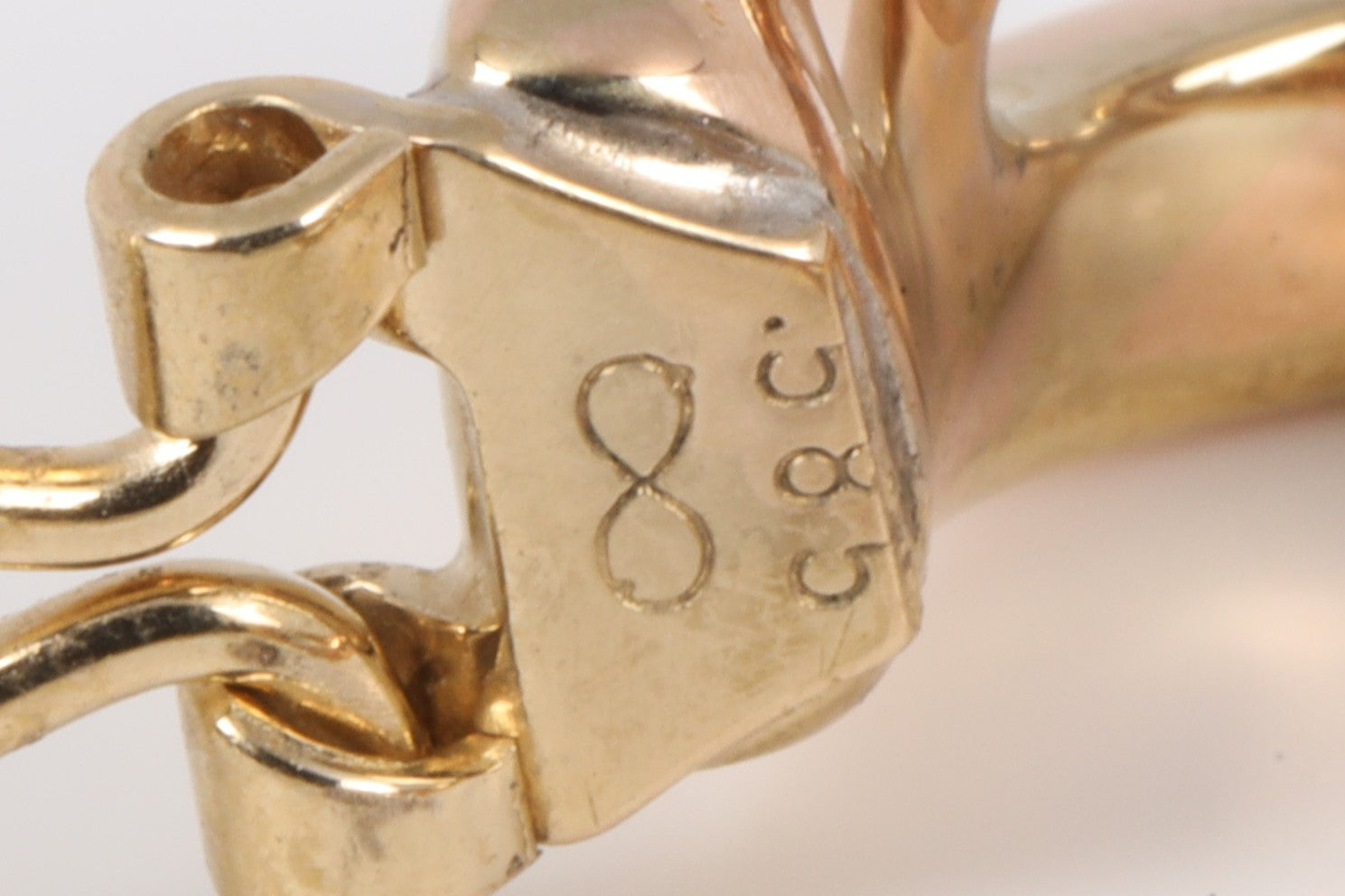 These elegant crossover hoop earrings are crafted in 14k yellow and rose gold, creating a striking two-tone design that adds subtle dimension and shine. Measuring 20.00mm in length, they’re secured with comfortable omega backs and engraved with “ISRAEL” and the infinity symbol. A versatile pair for everyday wear or elevated occasions. Approximate retail: $840.