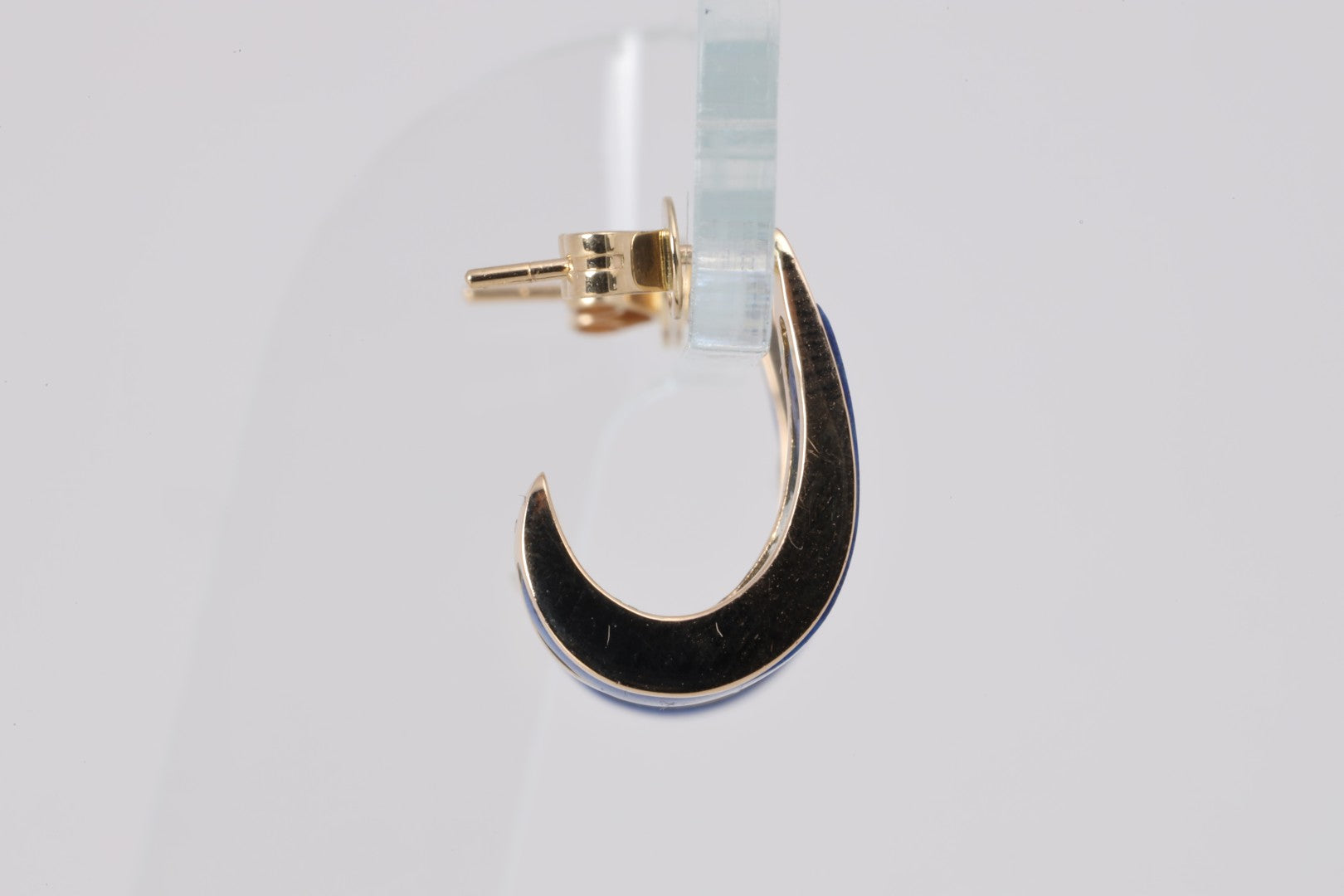 These elegant half hoop earrings are crafted in 14k yellow gold and inlaid with rich blue lapis lazuli. The pair features two inlay-cut stones totaling approximately 0.12 carats, offering a subtle yet striking pop of color. Measuring 17.50mm in length with a comfortable push back closure, these earrings weigh 3.67 grams and are perfect for both everyday wear and special occasions.
