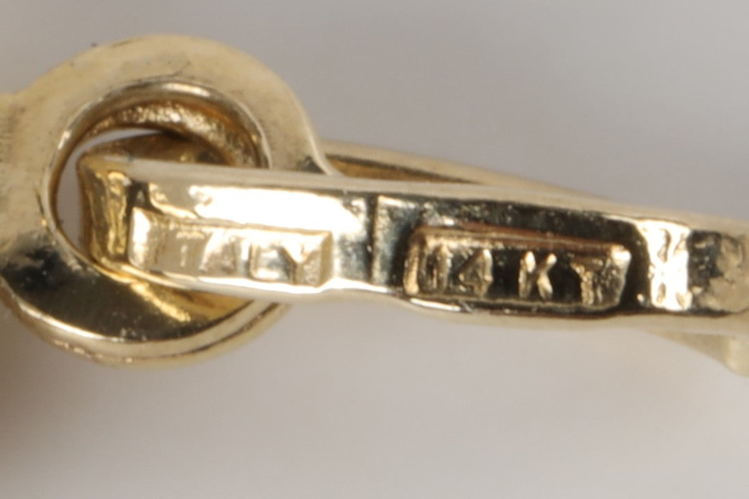 This dreamy 14k yellow gold crescent moon pendant has a soft, puffy design that catches the light beautifully. Marked “Italy,” it weighs 2.06 grams and measures just over 1 inch in length, including the bail. A timeless celestial symbol, this piece makes a thoughtful gift, a meaningful keepsake, or a versatile addition to any gold chain.