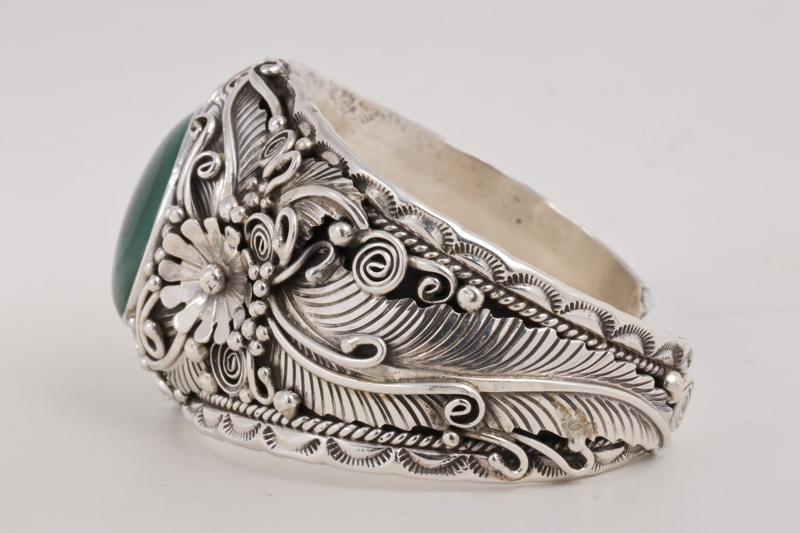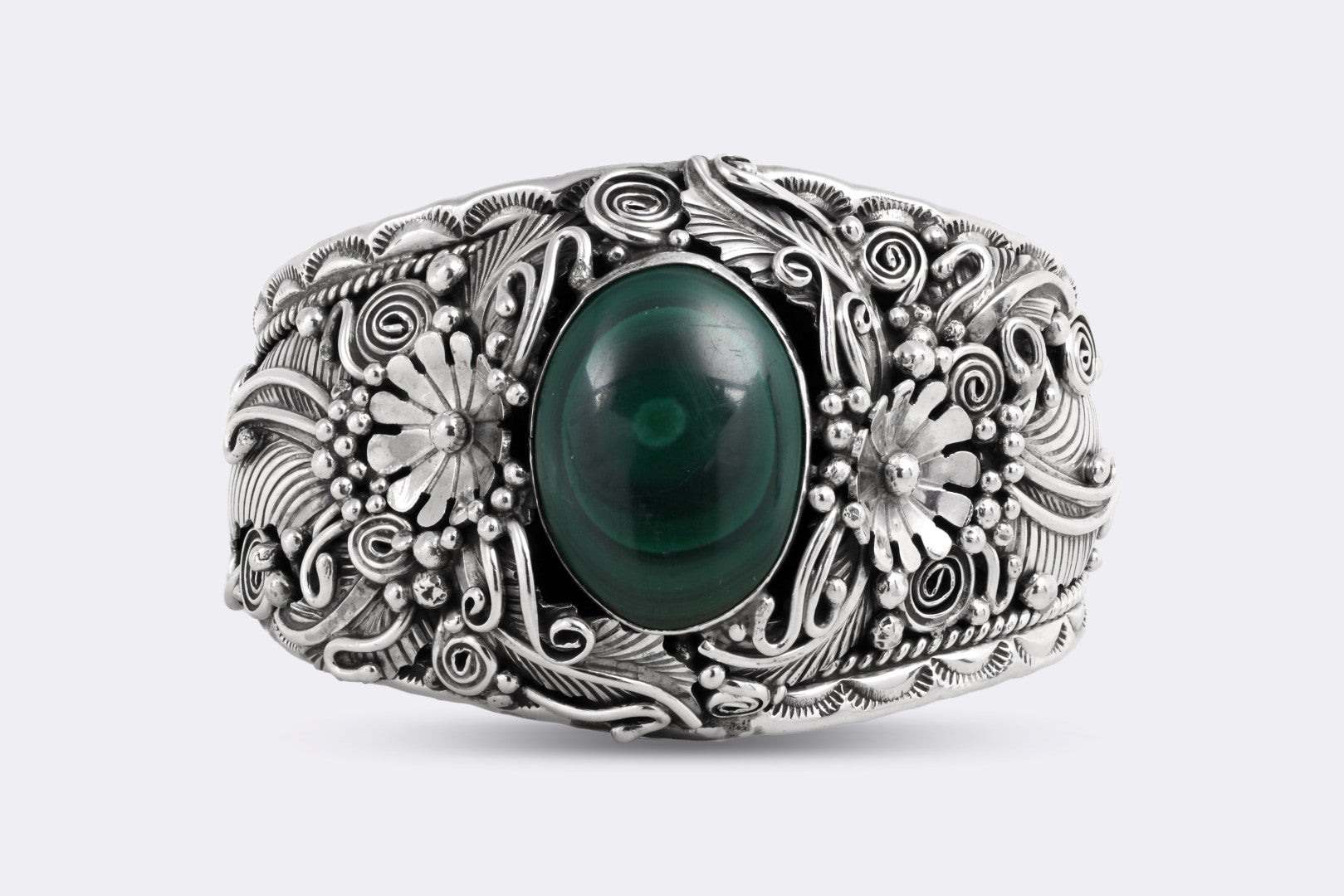 This sterling silver cuff bracelet is a striking example of ornate Southwestern-inspired design. A bold malachite cabochon, measuring 18.50mm x 25.00mm, anchors the piece with its natural bands of green, while the wide floral filigree silverwork creates an intricate frame around the stone. The contrast of rich malachite and polished silver gives this bracelet a dramatic yet timeless appeal.