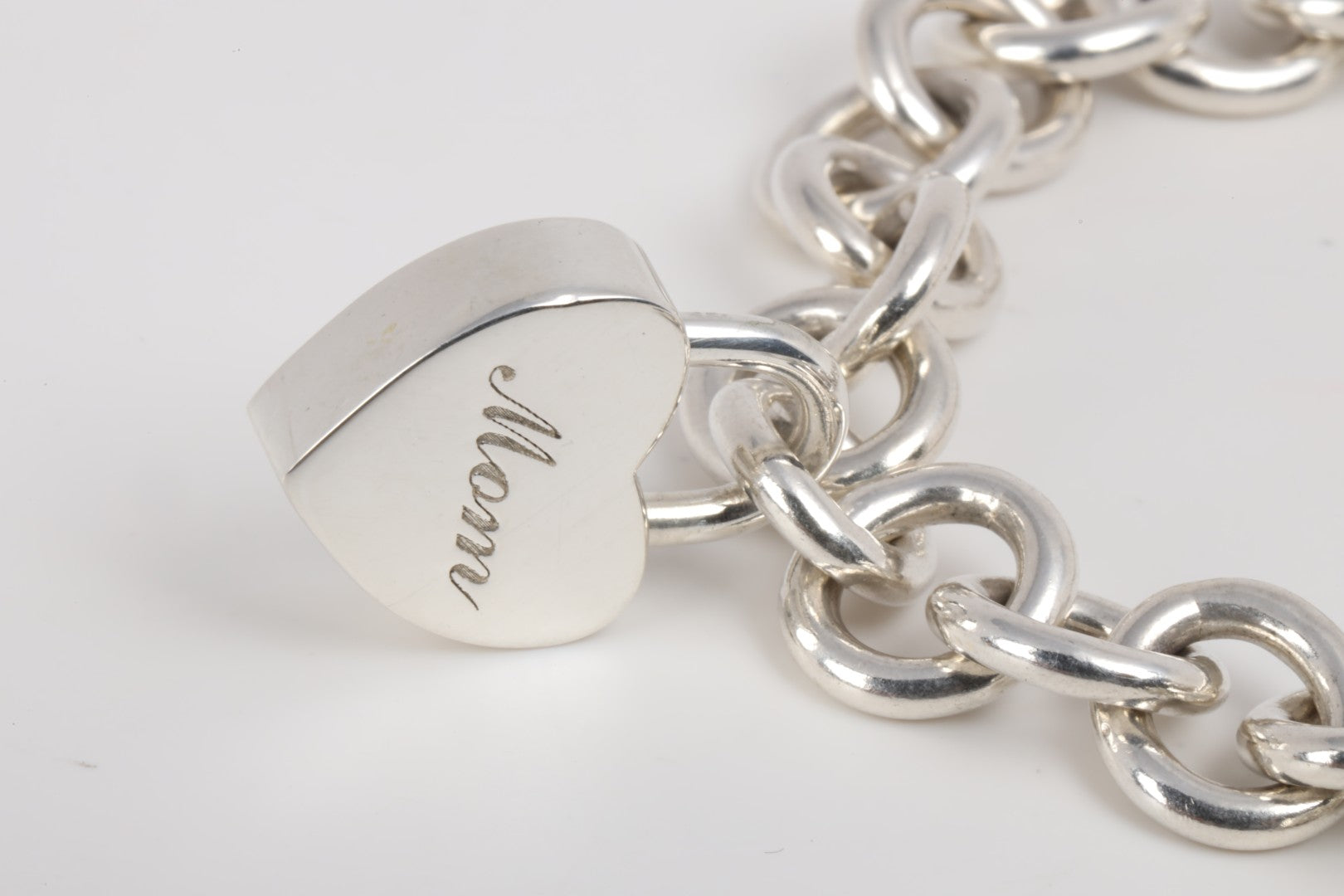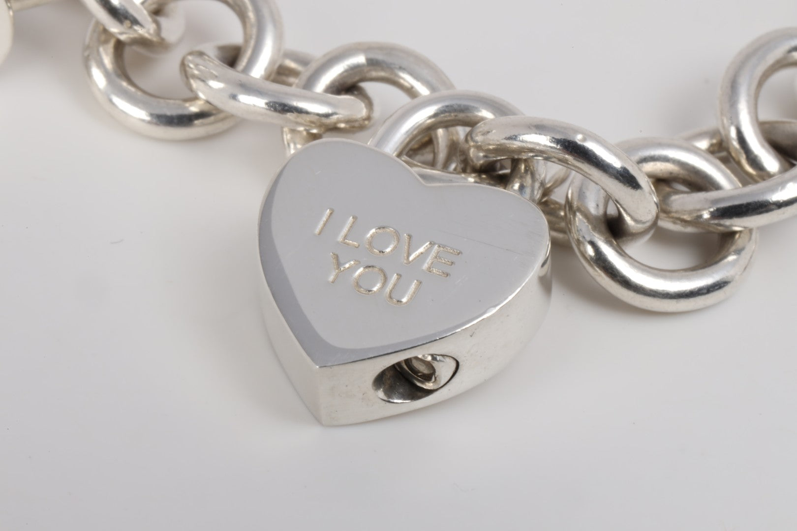 This Tiffany & Co. bracelet is crafted in sterling silver and features the iconic heart tag charm, along with additional engraved charms reading “I love you” and “Mom.” Weighing 57.42 grams, the substantial oval link chain design offers both presence and classic Tiffany appeal. Measuring 7.75 inches unclasped, it fits wrists up to 6.75 inches. A meaningful and timeless Tiffany collectible. Approximate retail: $975.