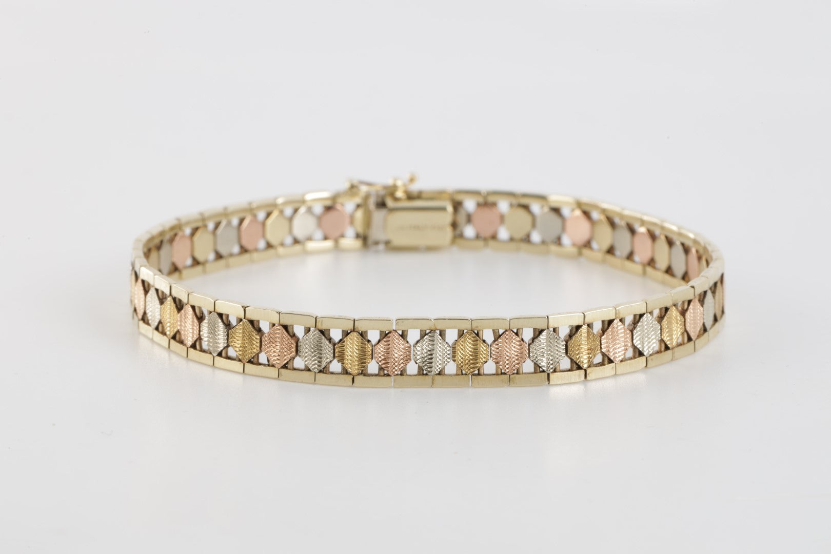 7" 14k Tri-Tone Gold Geometric Flat Link Chain Bracelet (13.66g.)