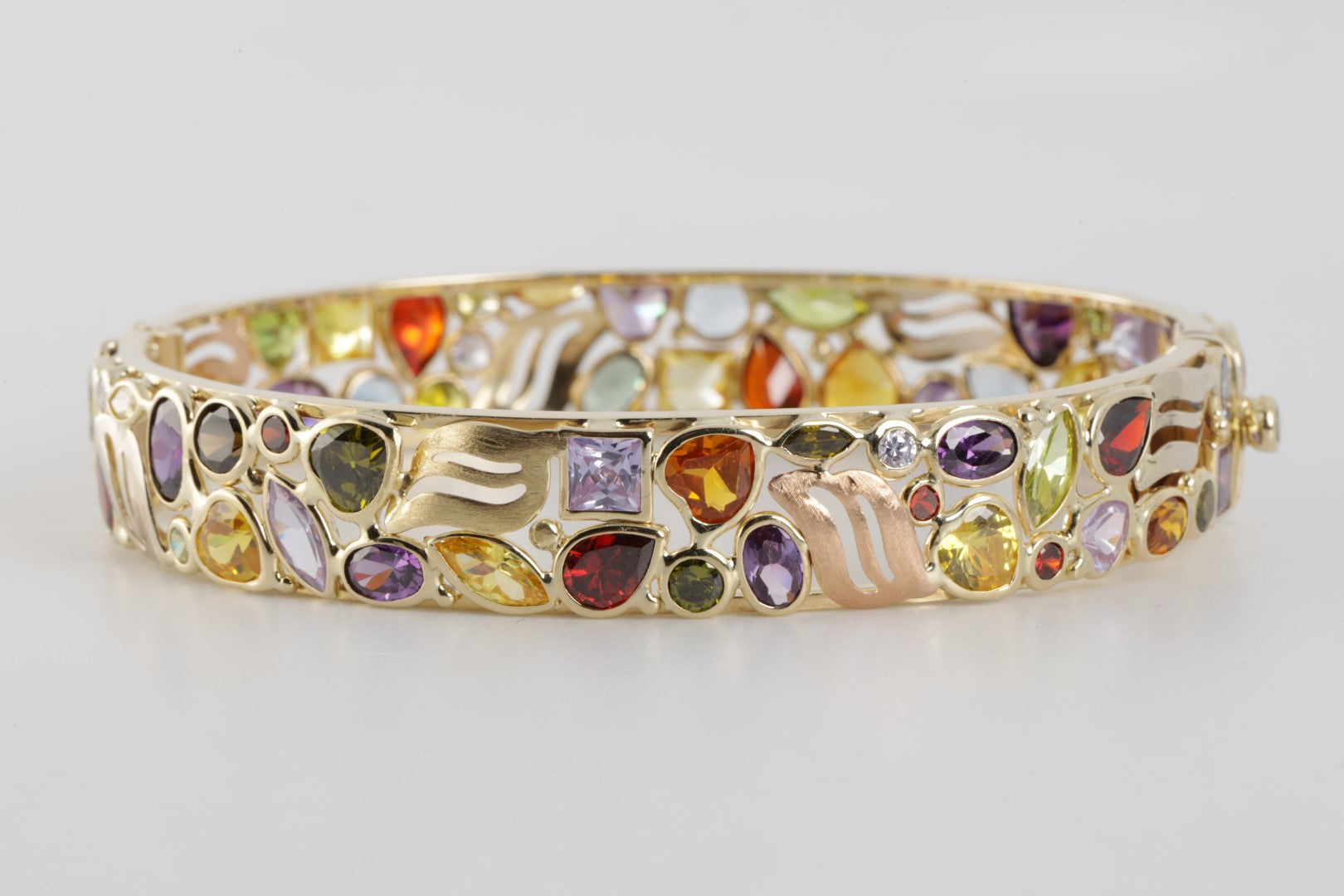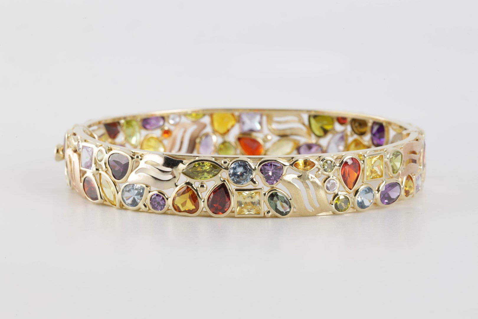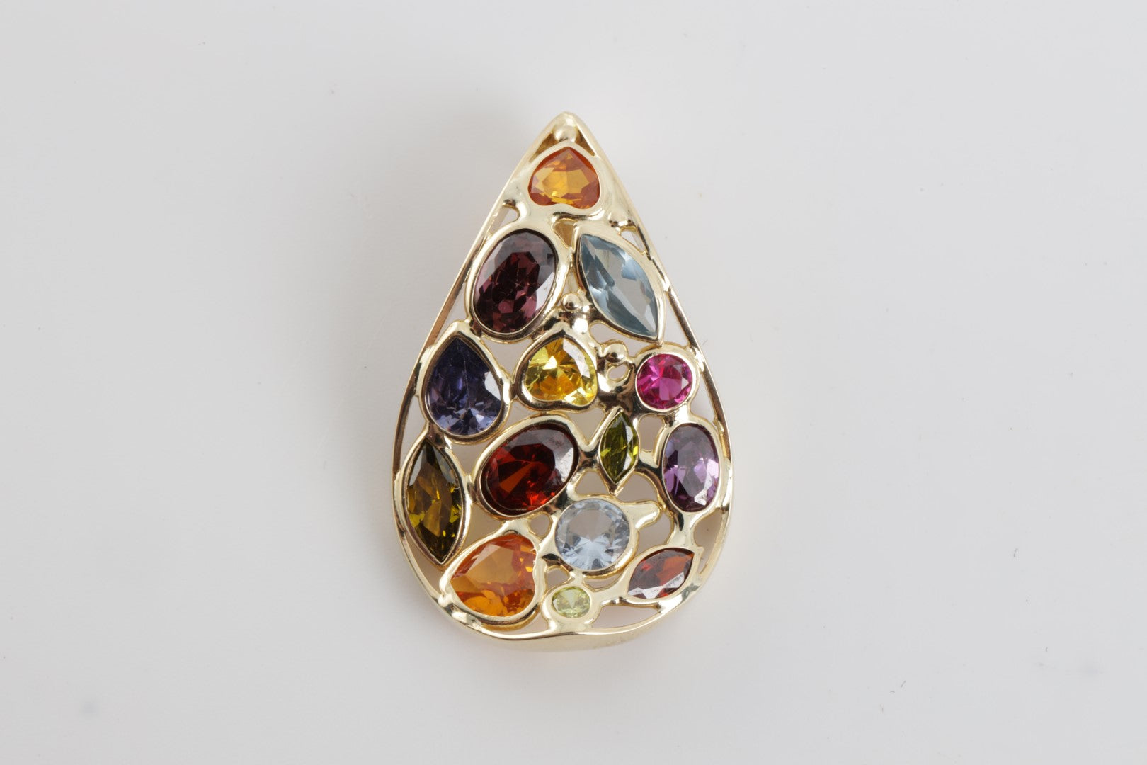 - Gemstones: Approximately 80.00 carats total weight; Red Garnet, Blue Topaz, Peridot, Amethyst, Citrine, Tanzanite, Smokey Quartz, Orange Garnet, Synthetic Ruby, Orange Sapphire, Green Garnet; cuts include Round, Oval, Heart, Pear, Marquise, Princess, and Drop