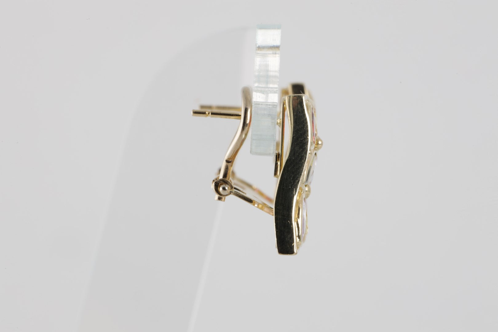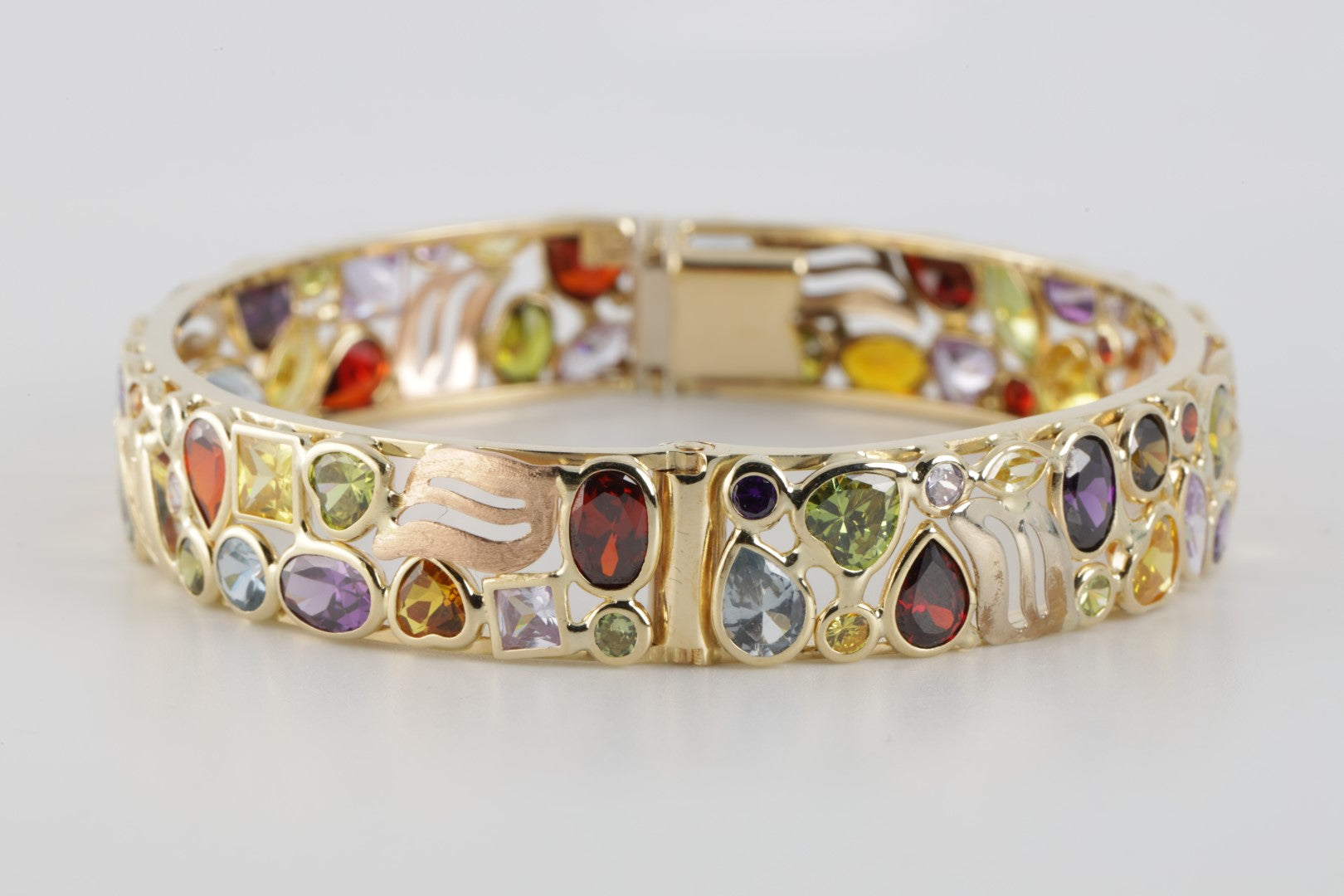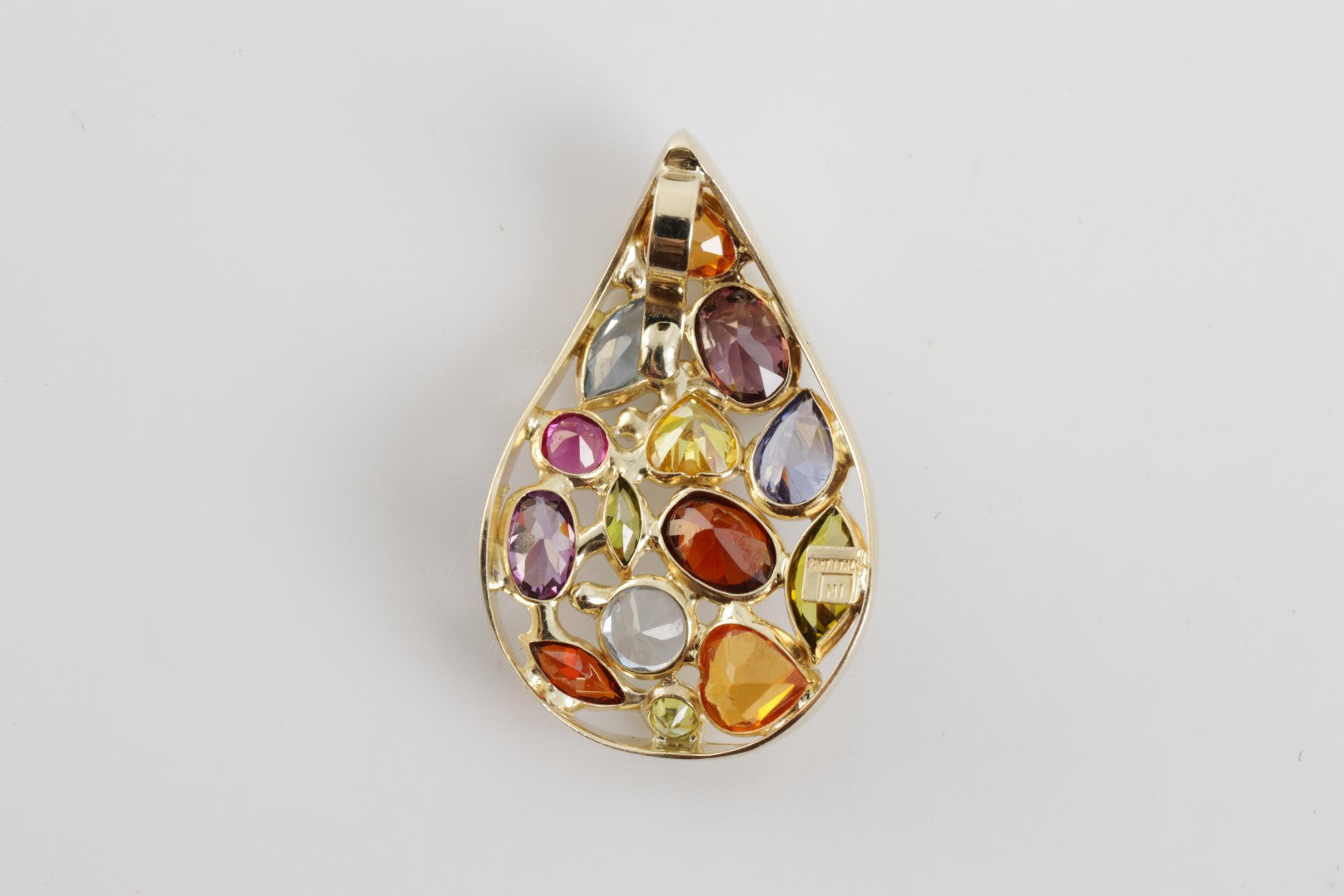This stunning jewelry set is crafted in 14k yellow gold and includes a bracelet, earrings, and pendant, all adorned with an array of vibrant gemstones. Featuring a diverse palette of gems such as red garnet, blue topaz, peridot, amethyst, citrine, tanzanite, smokey quartz, orange garnet, synthetic ruby, orange sapphire, and green garnet, this set delivers a striking combination of color and luxury. The total gemstone weight is approximately 80.00 carats, with stones cut in various shapes including round, oval, heart, pear, marquise, princess, and drop cuts. The pieces are stamped “14k” and engraved with “ITALY” and “MI.” Approximate retail: $8,000.