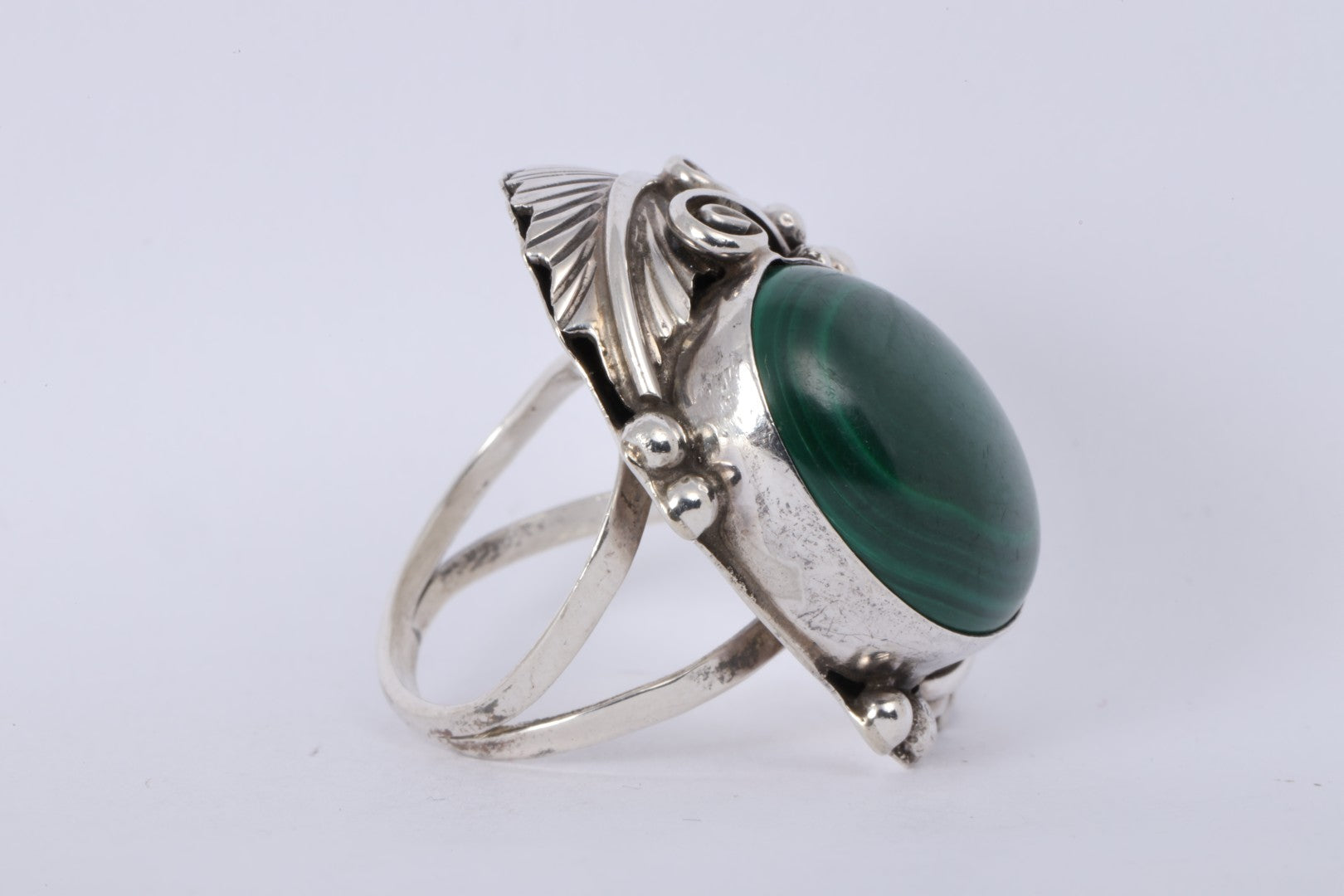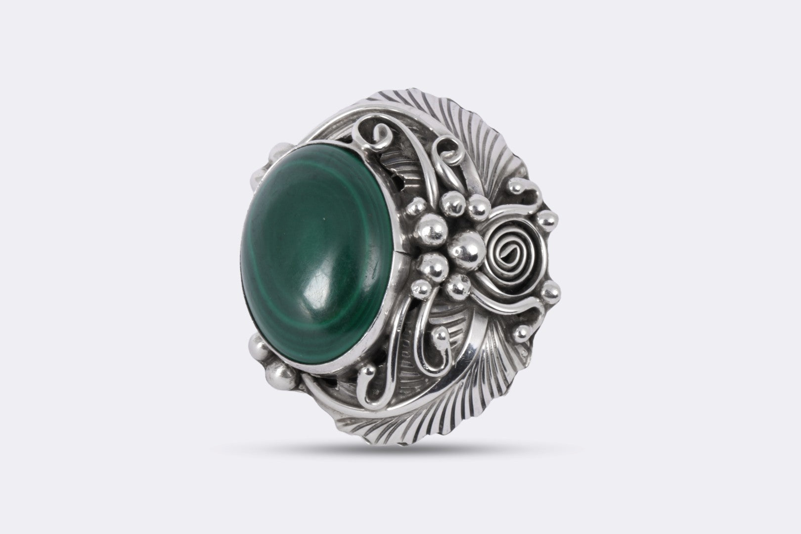 This ornate sterling silver ring features an elegant oval malachite cabochon measuring approximately 14.5mm × 19.5mm, framed by intricate filigree petals in a floral motif. The vivid green banding of the malachite contrasts beautifully with the polished silver, creating a striking vintage-inspired statement piece. PM Number: PM4011048.