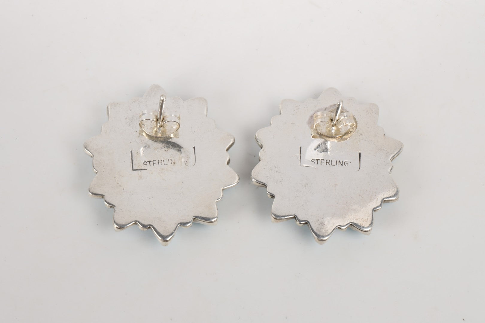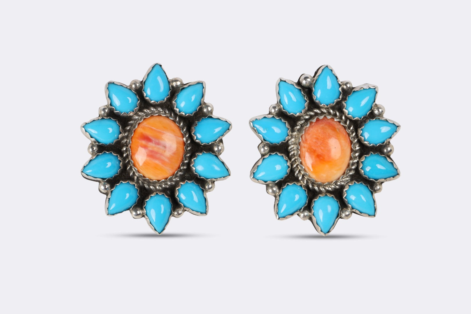 These Navajo Native earrings are crafted in sterling silver and designed in a bold floral motif, inlaid with vibrant blue turquoise and a single striking spiny oyster shell cabochon at the center. Weighing 9.55 grams, they showcase the skill of Native silversmithing, with push-back closures for secure wear. A colorful and collectible addition to any Southwestern jewelry collection.