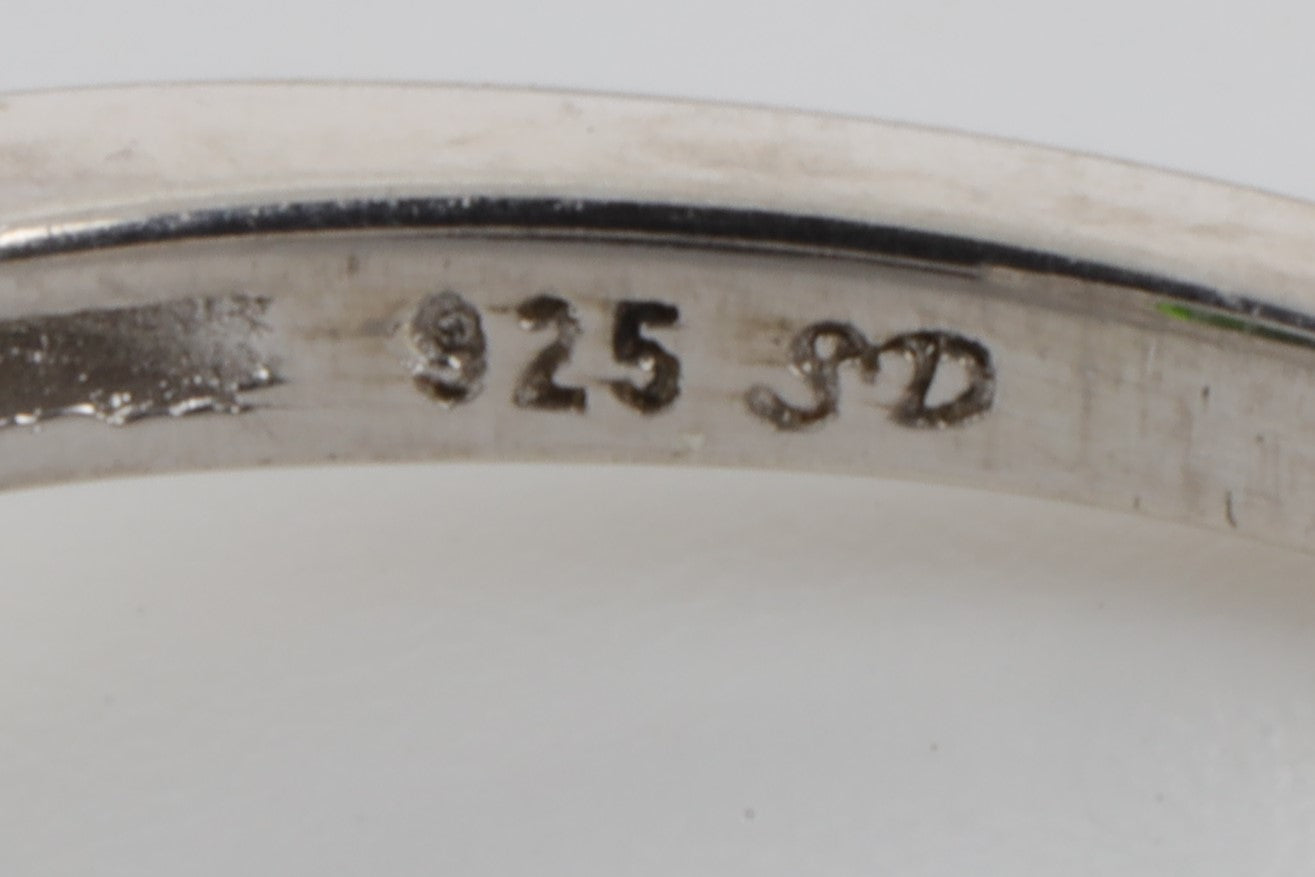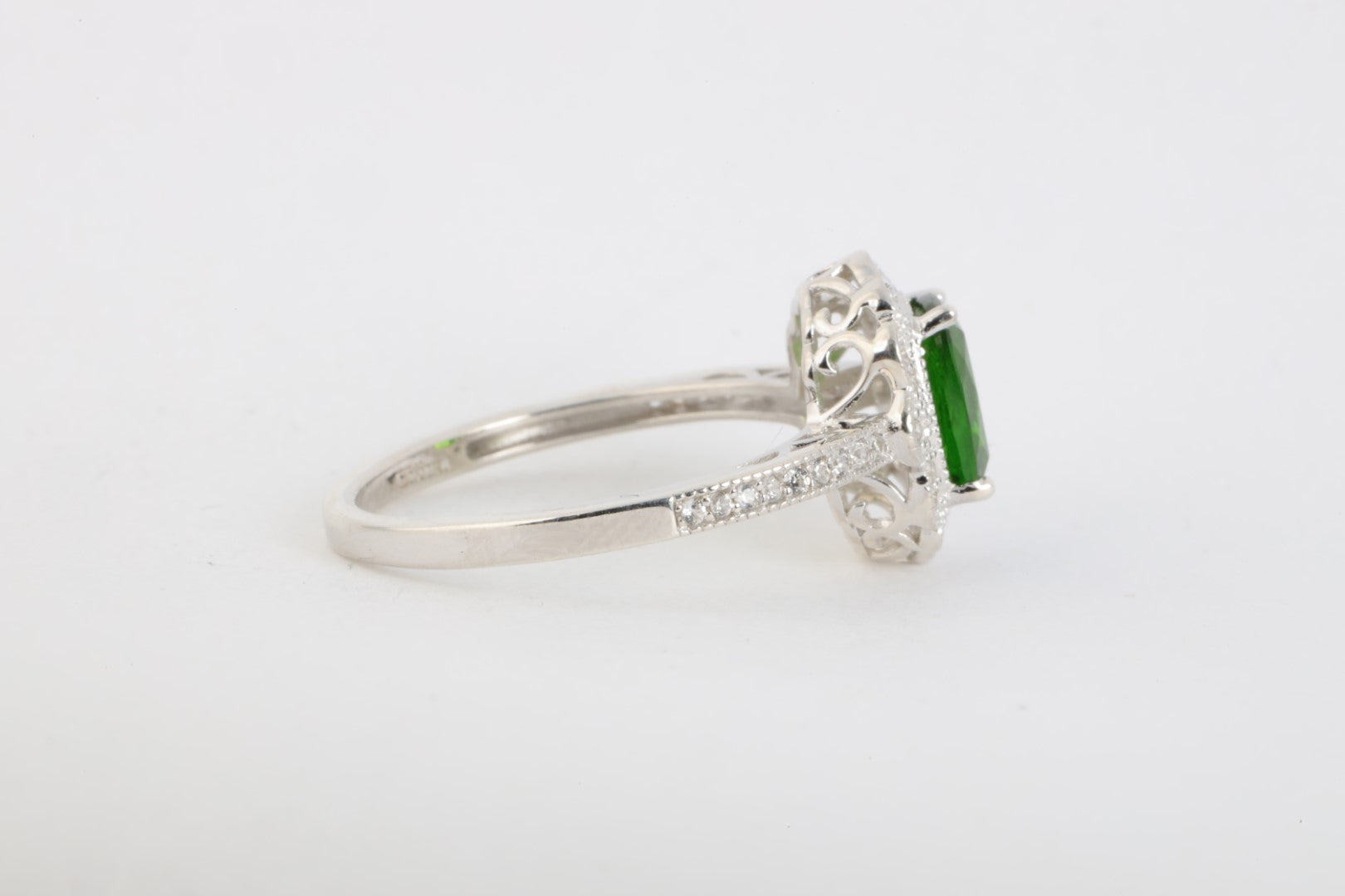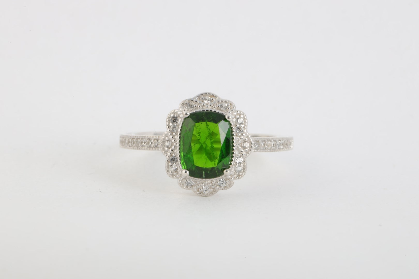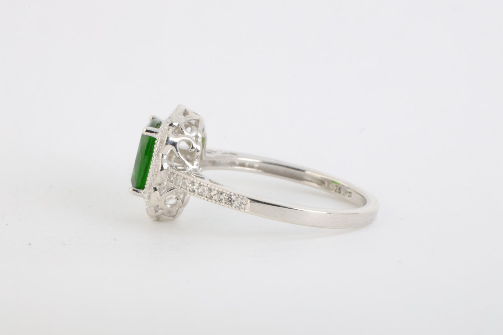 This eye-catching ring is crafted in 925 sterling silver and weighs 2.81 grams. Professionally authenticated and marked with maker’s marks, it features an oval-cut green diopside weighing approximately 1.94 carats, accented by 34 round brilliant diamonds totaling approximately 0.170 carats. Originally retailing for $700, this piece offers a vivid combination of color and sparkle.