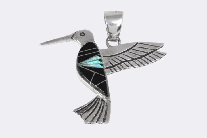 This handcrafted hummingbird pendant by Navajo artisan Calvin Begay features intricate inlay work of luminous white opal and deep black onyx. Crafted in sterling silver, the piece showcases fine Native American artistry and symbolism. Weighs 13.35 grams. Approximate retail: $220.
