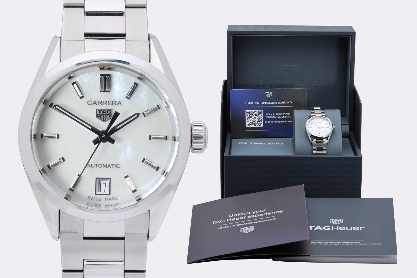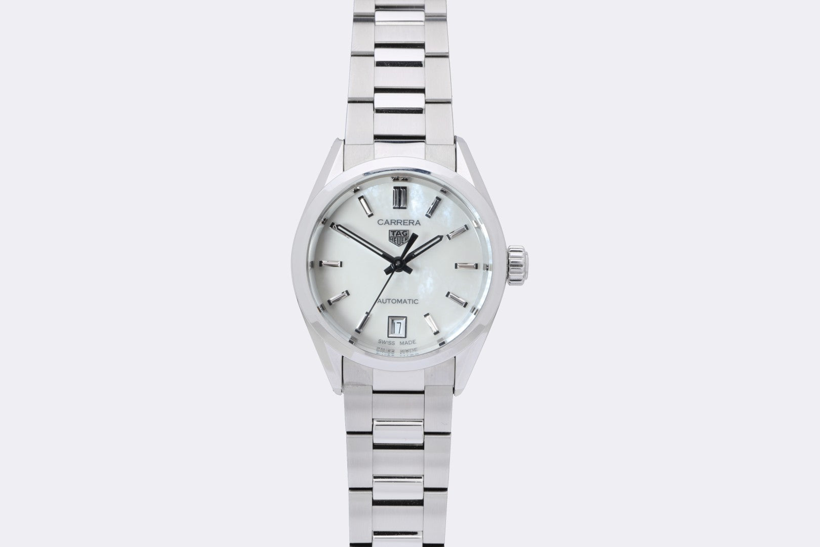 This 2025 example features a beautifully executed mother-of-pearl dial that catches the light with subtle iridescence, framed by a sleek 29mm stainless steel case. Powered by TAG Heuer’s automatic Calibre 9 movement and paired with a matching stainless steel bracelet, this Carrera balances elegance with everyday wearability. The exhibition caseback offers a glimpse of the movement inside, underscoring its mechanical craftsmanship.