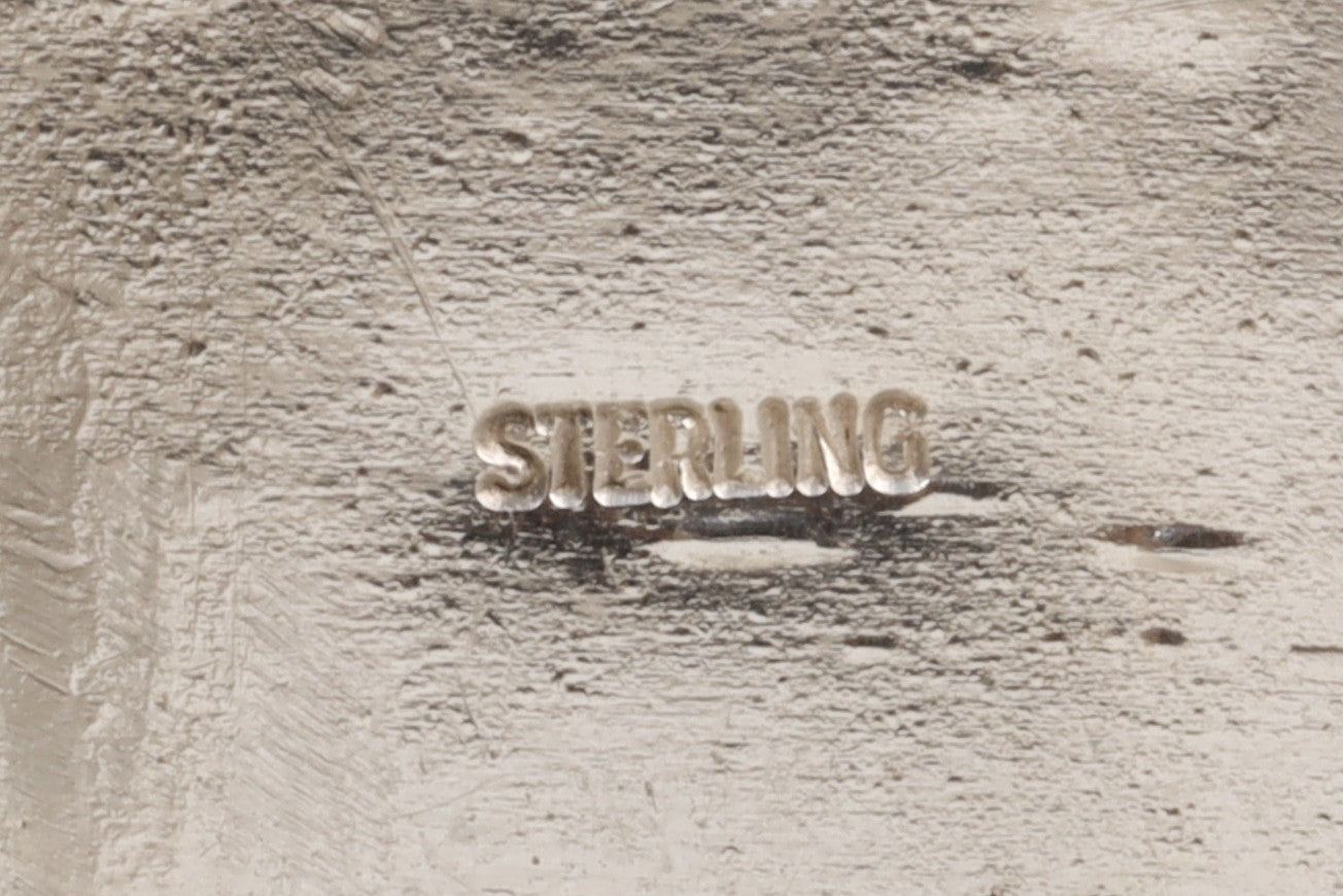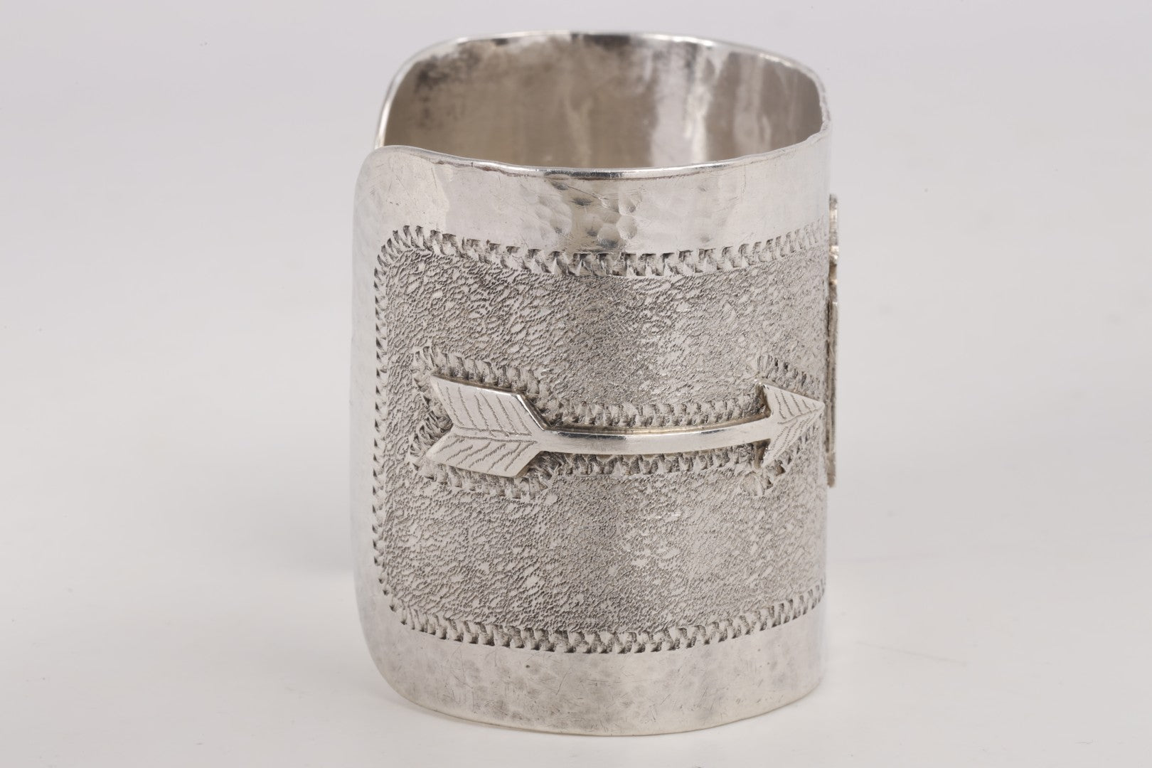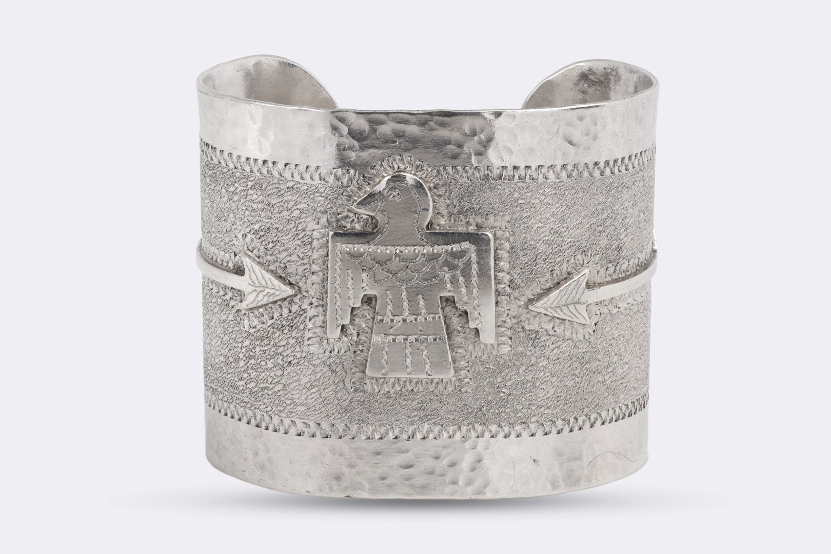 This powerful Native American cuff bracelet is handcrafted in sterling silver and showcases a bold Thunderbird motif, a sacred symbol of strength and protection in Native tradition. Weighing a substantial 78.18 grams, the wide 2-inch band makes a dramatic statement while honoring cultural heritage. Stamped “Sterling” and left unmarked by maker, this piece embodies traditional craftsmanship and timeless design.