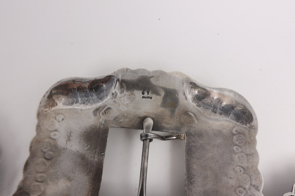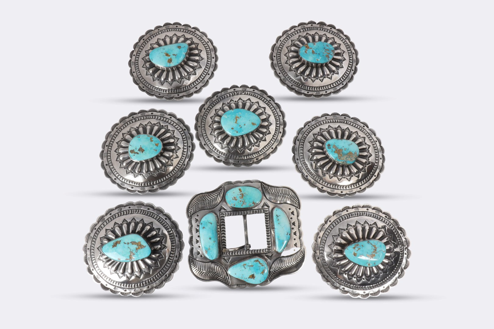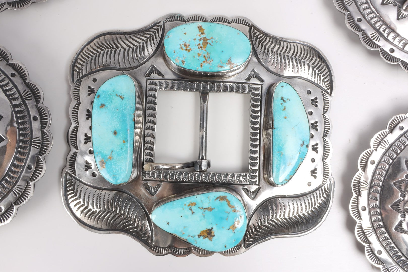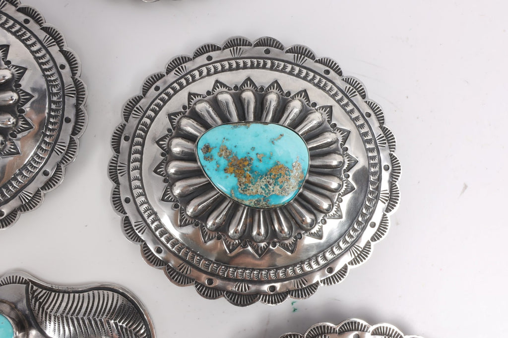 This exceptional 8-piece concho belt set by Navajo artisan Geraldine Yazzie showcases masterful silverwork and vibrant turquoise stones. Each concho and the oversized buckle feature intricate stamping and traditional Navajo designs, highlighted by polished turquoise cabochons. At 683 grams, this sterling silver set is both a striking accessory and a highly collectible work of Southwestern art.