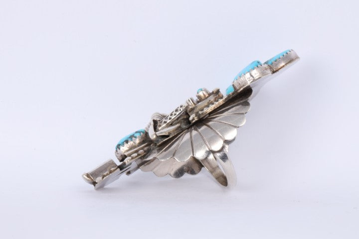 This handcrafted ring by Kachina features six vibrant blue turquoise cabochons totaling 3.55 carats, set in a bold sterling silver frame. With its wide face and detailed Native-inspired design, this size 6.25 piece is both striking and rooted in tradition.
