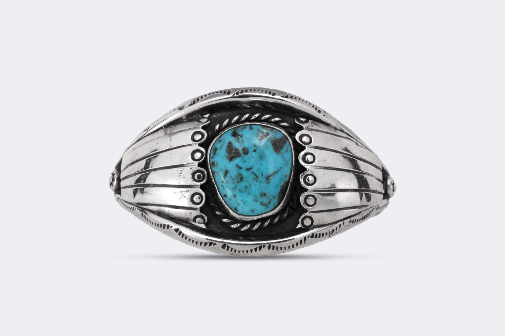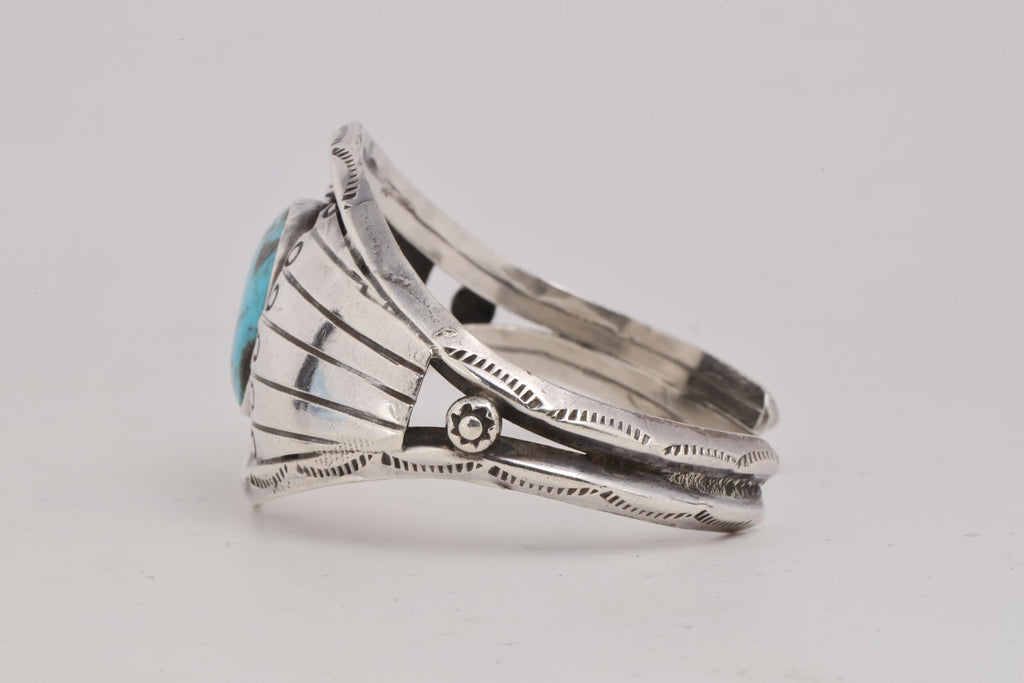 This striking Navajo cuff bracelet showcases a vibrant turquoise cabochon set in polished sterling silver. The natural robin’s egg blue stone is accented by clean inlay work and subtle hand-stamped details, reflecting the artistry and heritage of Native craftsmanship. Balanced in weight and design, it’s a timeless statement piece that celebrates the beauty of the Southwest.