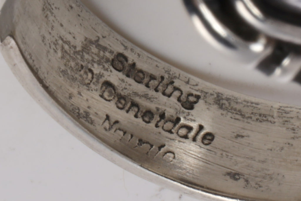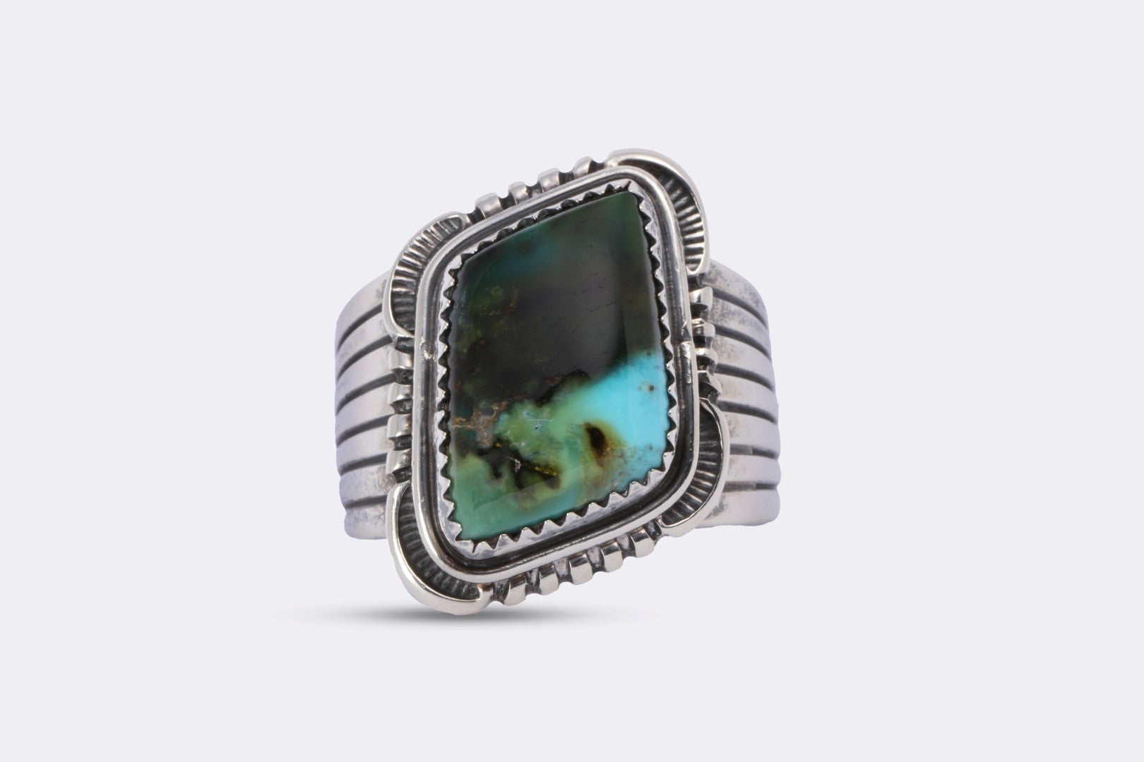 This bold Navajo ring by artist Will Denetdale features a stunning Royston turquoise cabochon with vibrant robin’s egg blue and green hues accented by natural brown matrix. Handcrafted in sterling silver, the setting showcases Denetdale’s masterful silversmithing with traditional Navajo motifs and exceptional stonework. A substantial, collectible statement piece. PM Number: PM2021168.