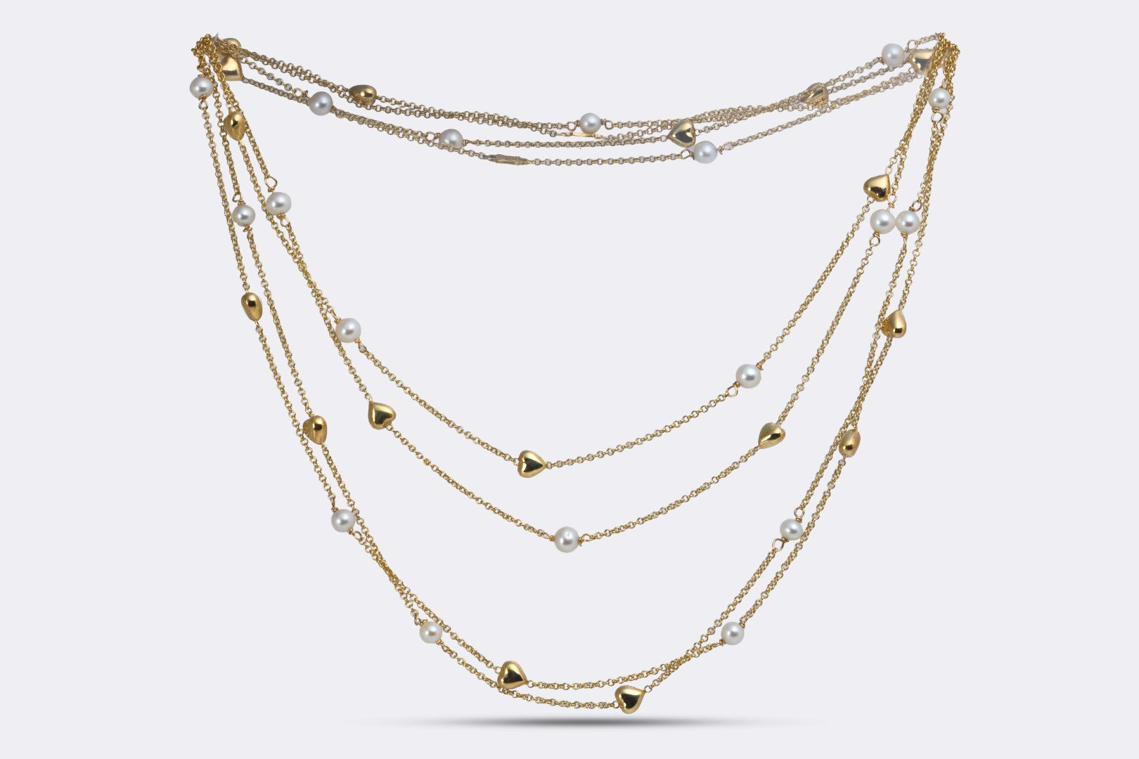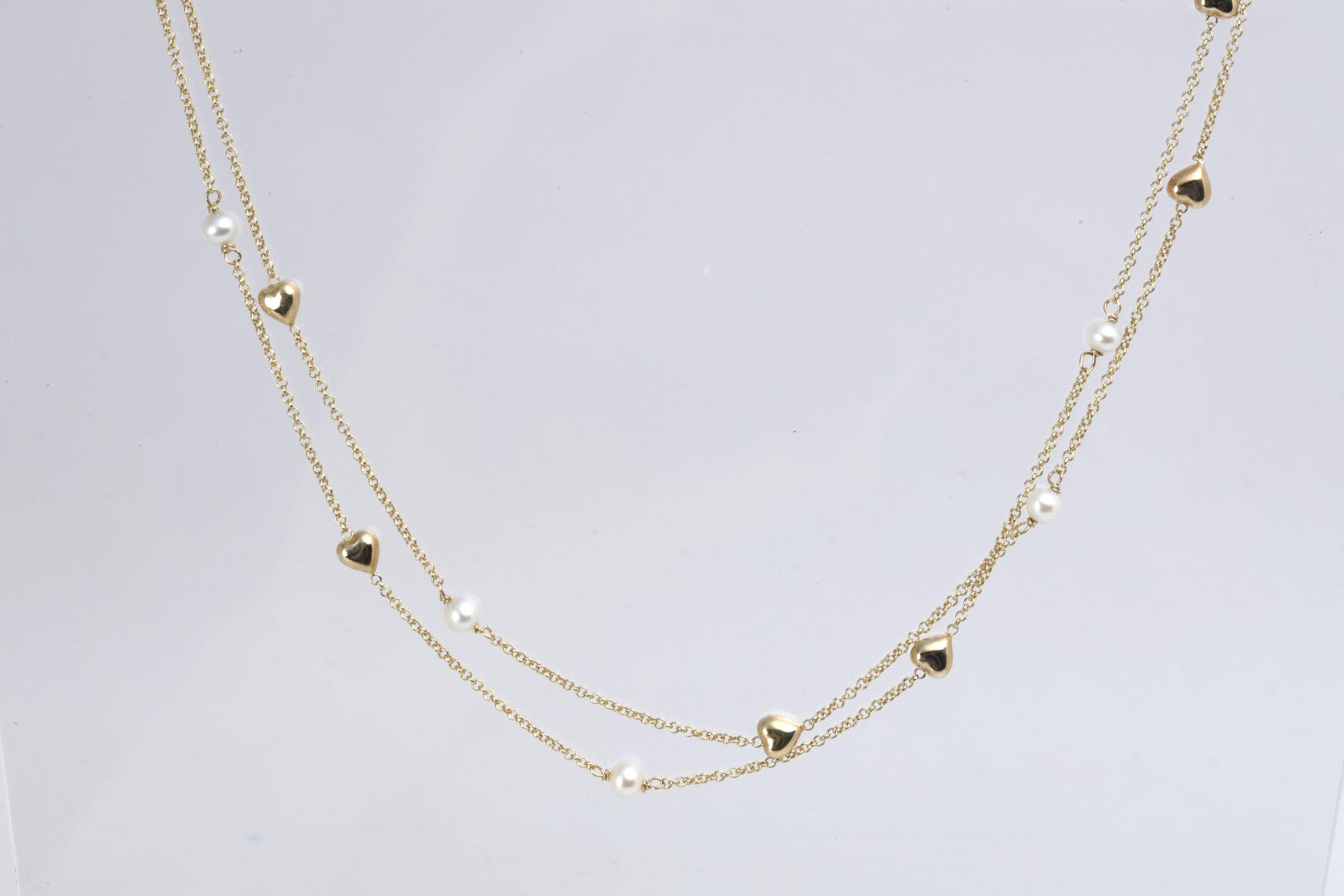 This elegant two-strand necklace set features delicate heart-shaped stations crafted in 14k yellow gold paired with luminous white pearls. Designed for layering, the strands measure 32 and 38 inches, making it versatile for both casual and formal wear. With 18 pearls stationed throughout, this piece offers a timeless balance of romance and refinement.