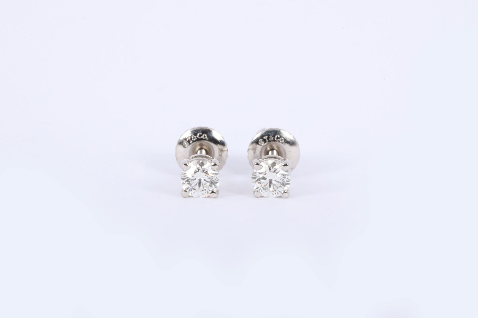 These classic Tiffany & Co. diamond stud earrings are crafted in 950 platinum and feature two round brilliant diamonds totaling 0.46 carats. The stones exhibit VS2+ clarity and D–I color, securely set with screw back closures. Each earring is stamped PT950 and engraved with "T&Co." Approximate retail: $3,660.