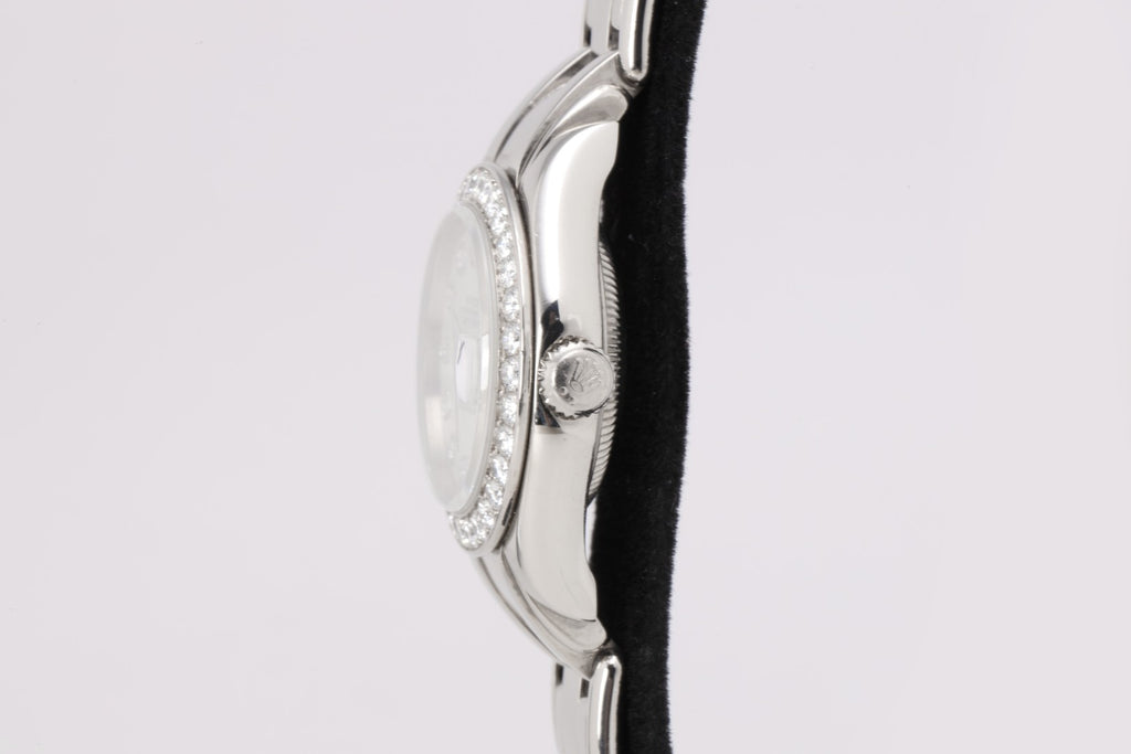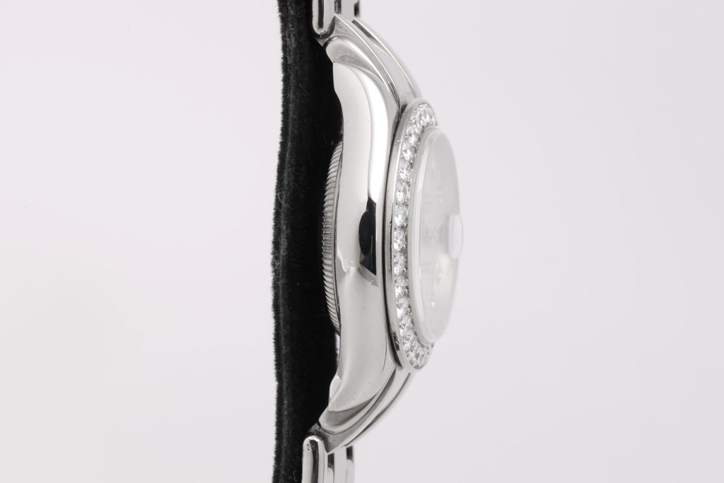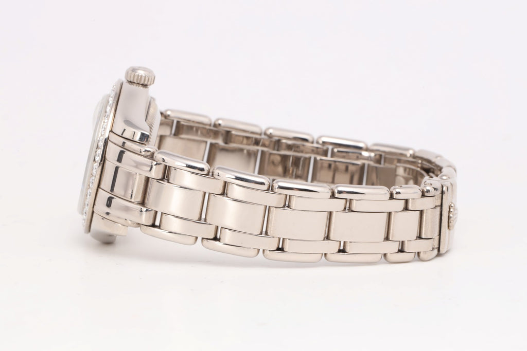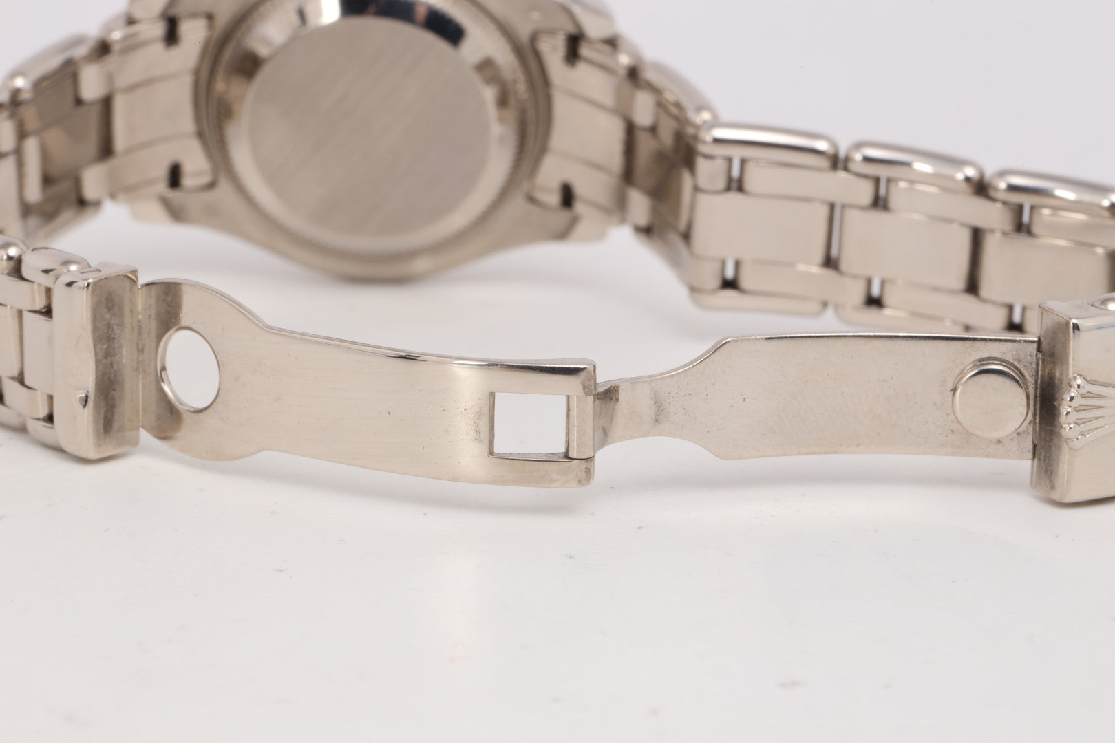 The Rolex Pearlmaster is one of the most coveted and exclusive ladies’ timepieces ever produced by Rolex — crafted only in solid gold and positioned above the standard Datejust line. This 1995 reference 69299 showcases the elegance that made the Pearlmaster a true icon: a sculpted 18k white gold case, matching Pearlmaster bracelet, and a stunning diamond-set bezel.