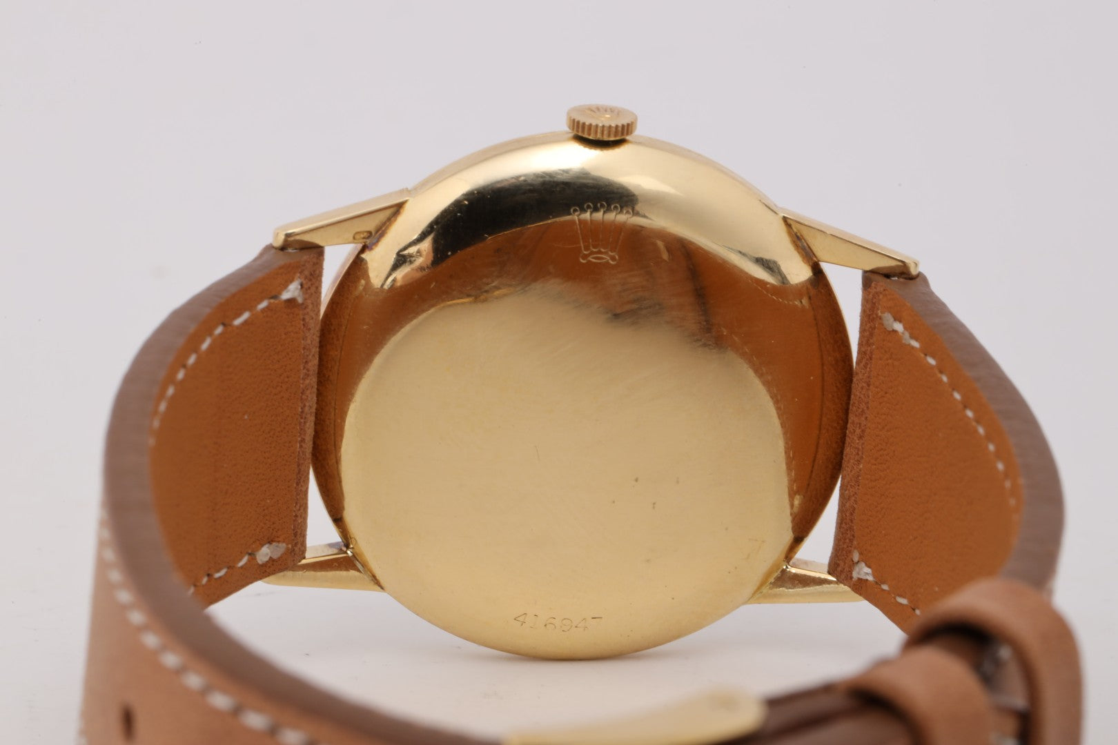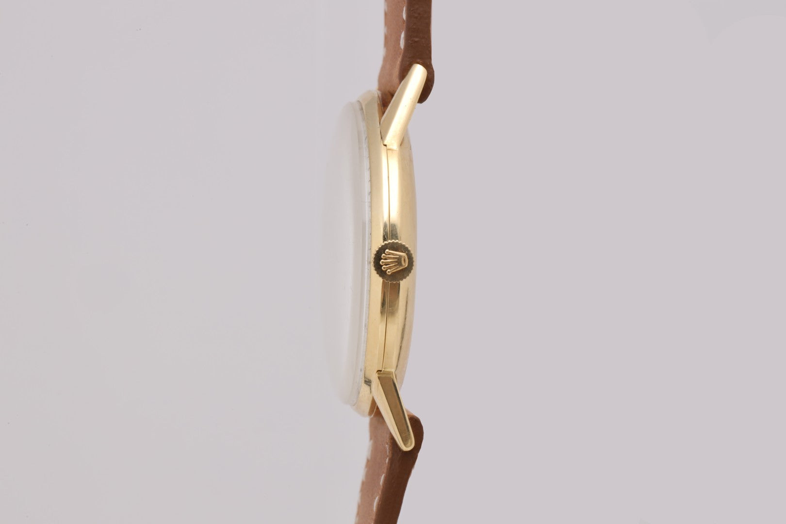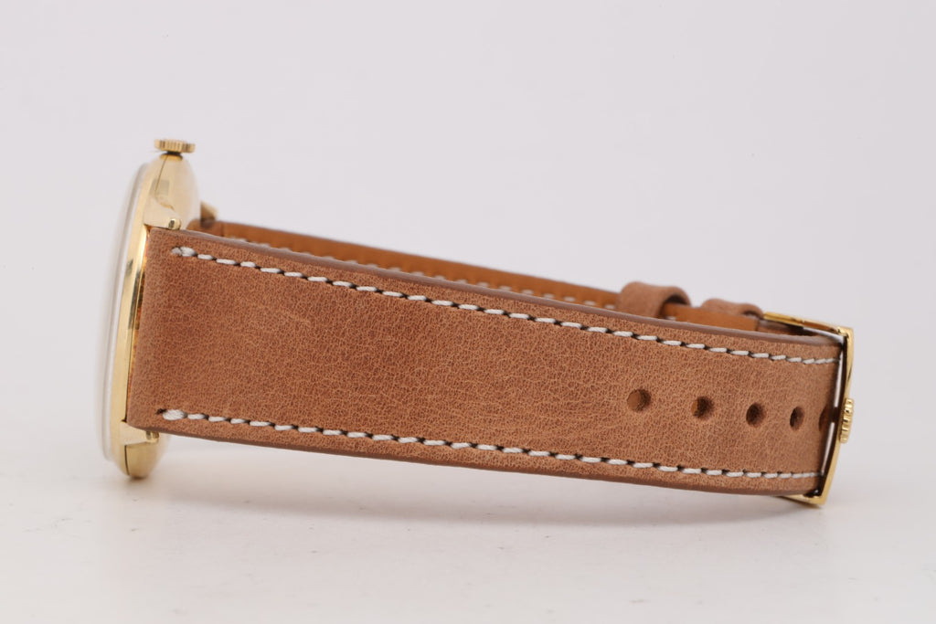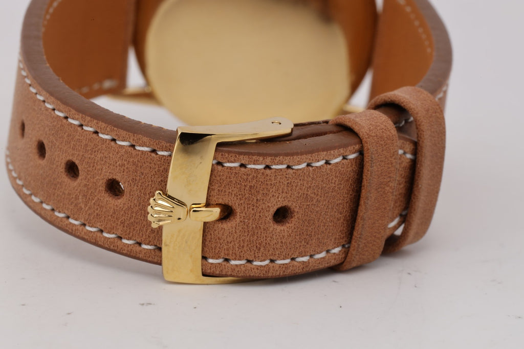 This watch remains in good overall condition (7/10) with a refinished dial and an aftermarket strap and buckle. The case shows normal wear consistent with age, while the movement performs reliably at -6 seconds per day. Fully inspected and approved by our in-house watchmaker, this Rolex Precision stands as an accessible entry into vintage gold Rolex collecting. PM Number: PM4007465.