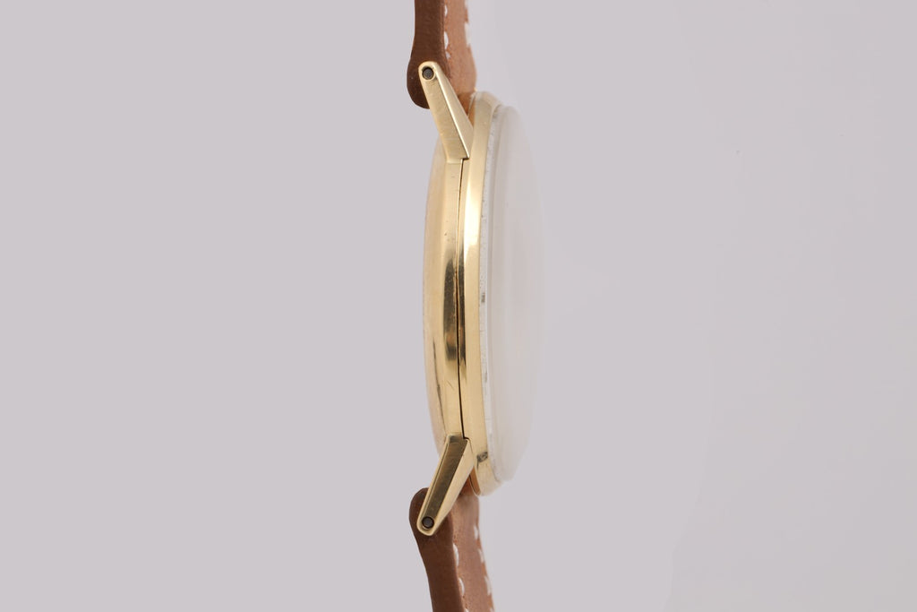 This elegant Rolex Precision 3667 is a refined example of Rolex’s mid-century craftsmanship, featuring a slim 33mm 18k yellow gold case that delivers understated luxury and timeless appeal. Manual-wind Precisions from this era continue to grow in desirability, especially those preserved in original gold cases like this one. The warm gold tones pair beautifully with the classic brown strap, making it a versatile dress piece suited for both collectors and everyday refinement.