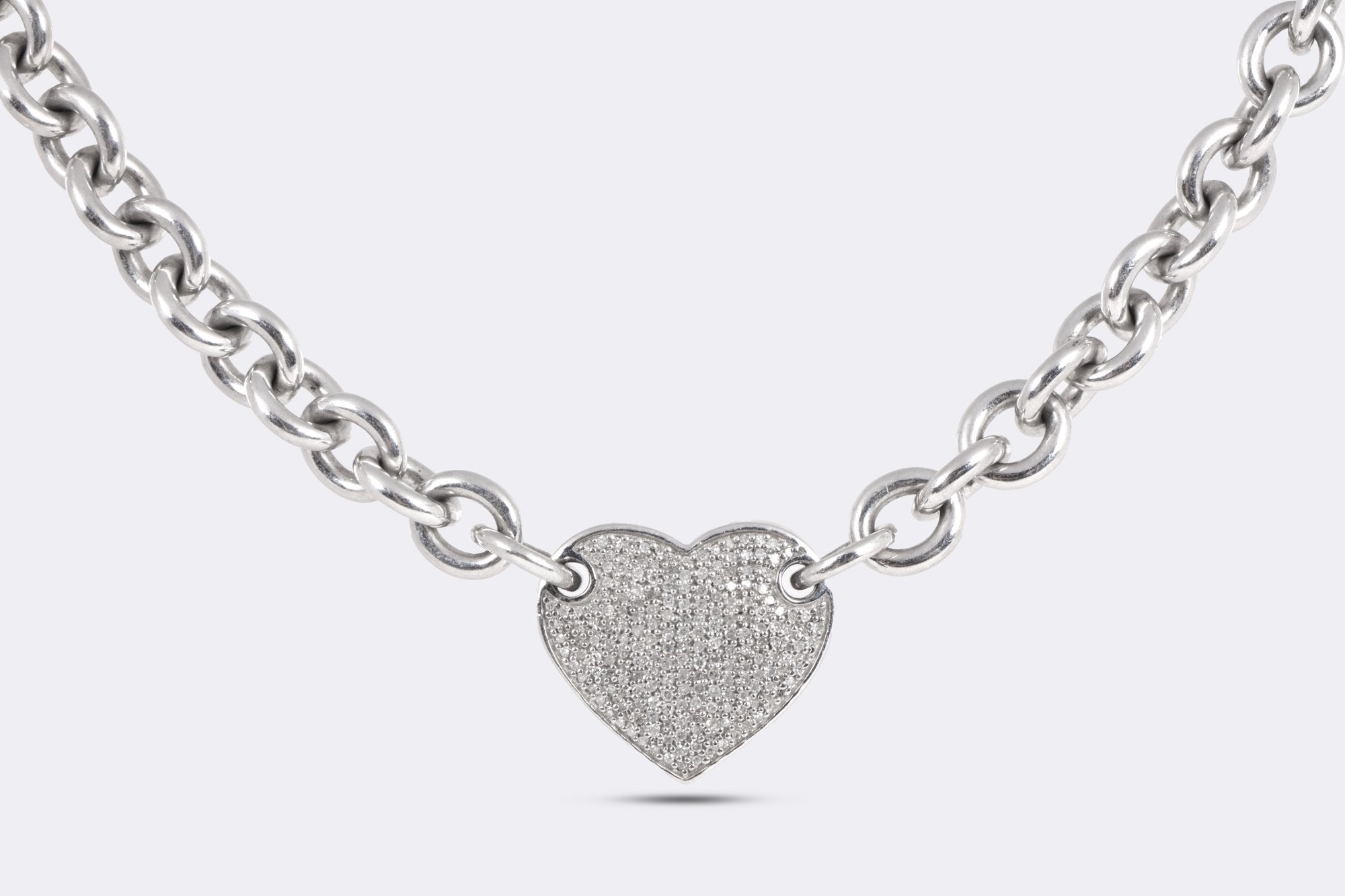 Elegant and radiant, this heart pendant necklace embodies refined craftsmanship and timeless allure. Meticulously fashioned in sterling silver and adorned with dazzling diamonds, it’s a piece that effortlessly balances sophistication with everyday wearability.