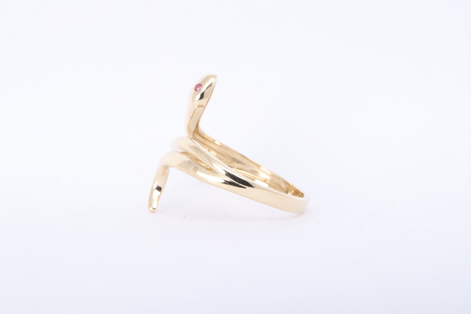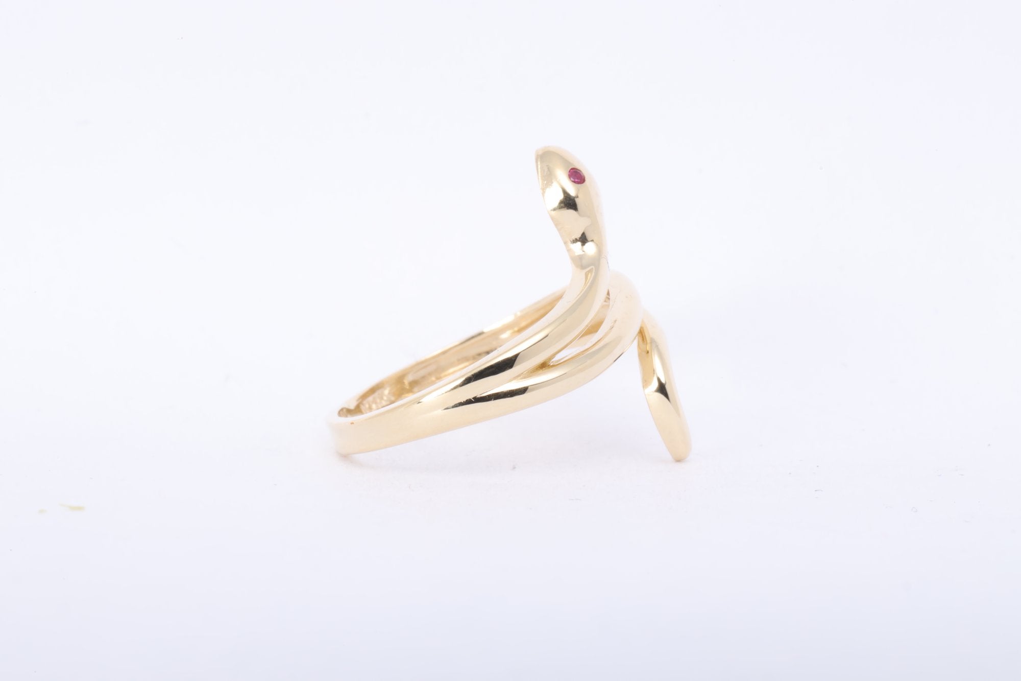 This exquisite ring, crafted from yellow gold, features a unique snake design. The eyes of the snake are adorned with two round cut rubies, adding a touch of color and intrigue to the piece.