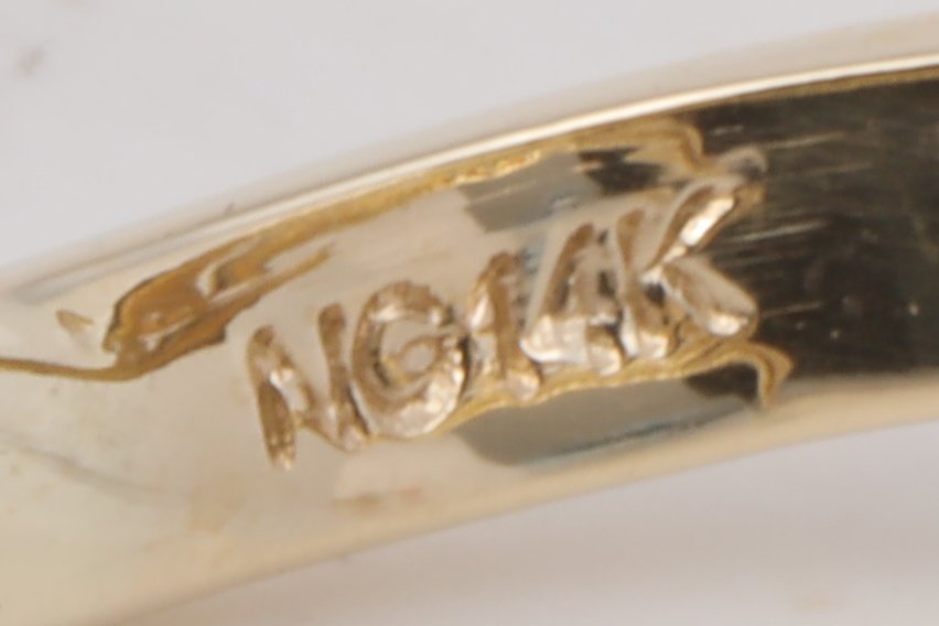 The ring is a size 8 and is not resizable. It bears the stamp '14k' and has a weight of 3.10g. The dimensions of the ring are 2.35mm - 21.55mm in width and 2.65mm in thickness.