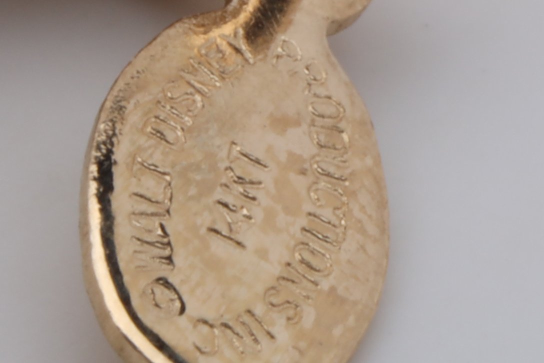 The pendant is marked with the inscription 'WALT DISNEY PRODUCTIONS INC.', a testament to its authenticity. It measures 20.80mm in length, 10.40mm in width, and 4.50mm in thickness, making it a delicate and lightweight accessory.