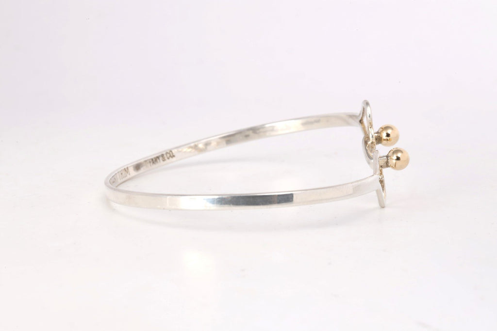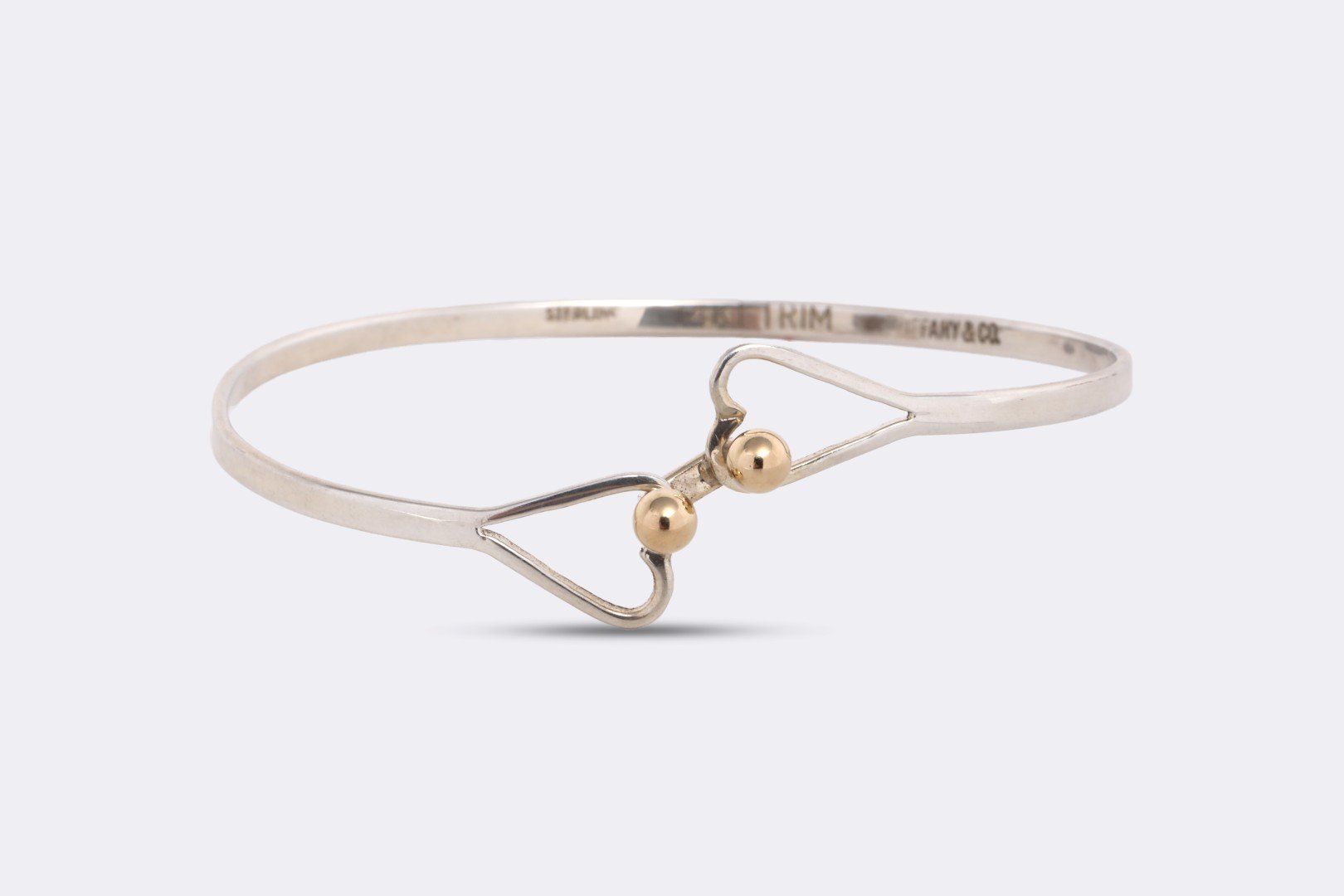 This elegant bangle from Tiffany & Co. is a timeless piece that adds a touch of sophistication to any outfit. Crafted from sterling silver and yellow gold, it features a double heart design that is both charming and chic.