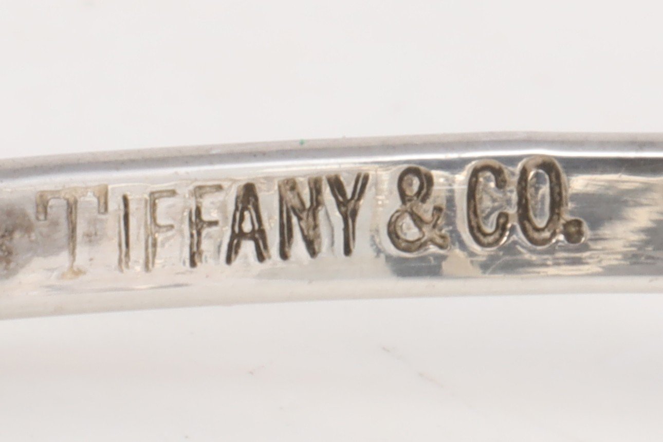 The bangle measures 6.25 inches in length, with a width of 2.50mm and a thickness of 1.00mm. It is secured with a hook clasp and bears the inscription "Tiffany & Co."