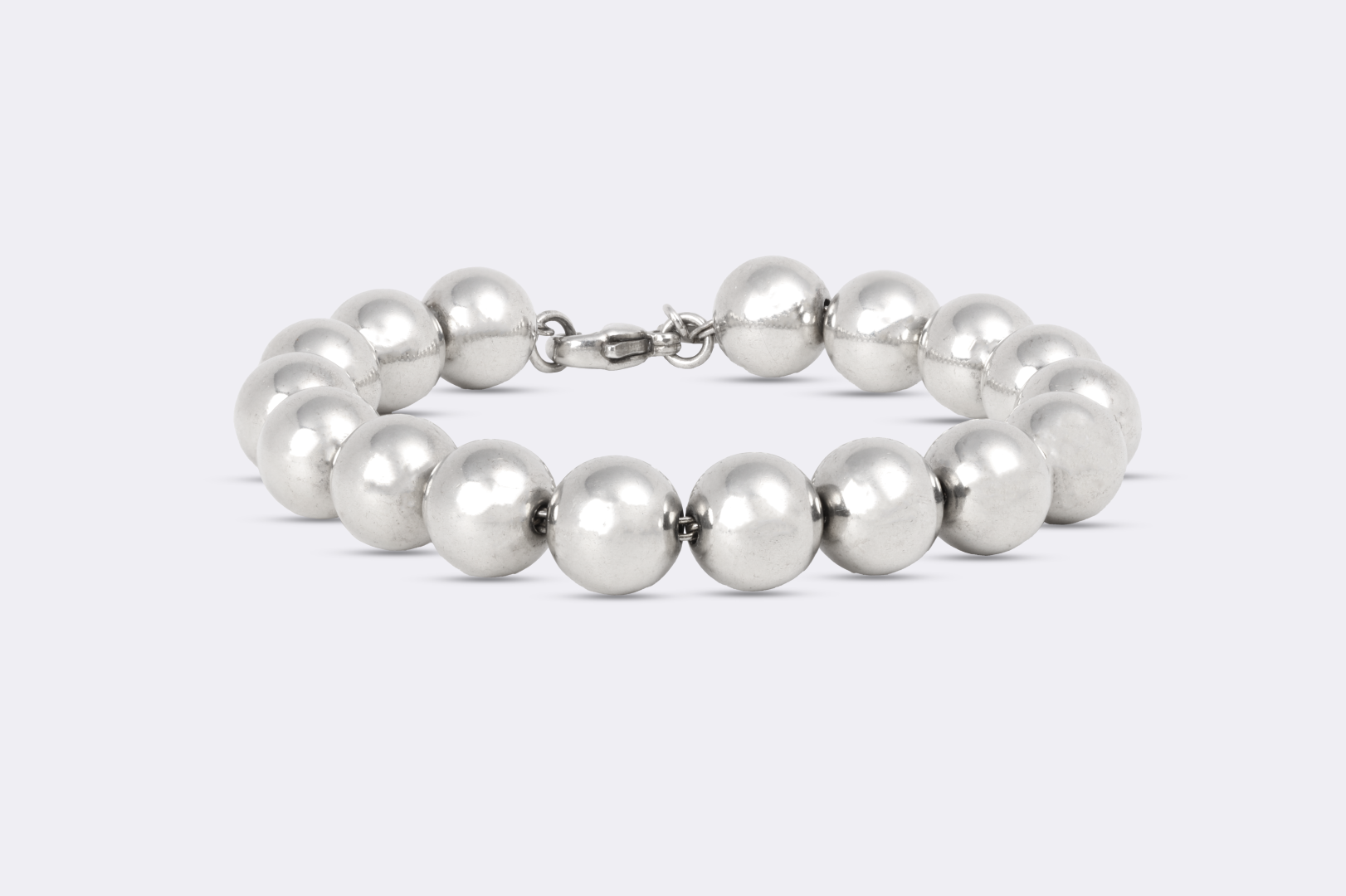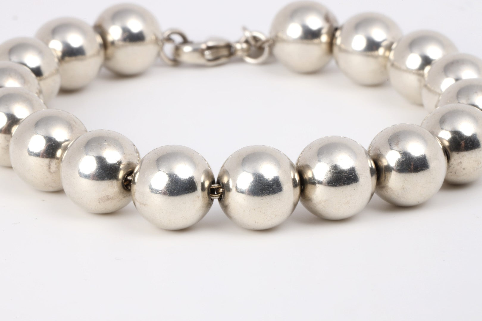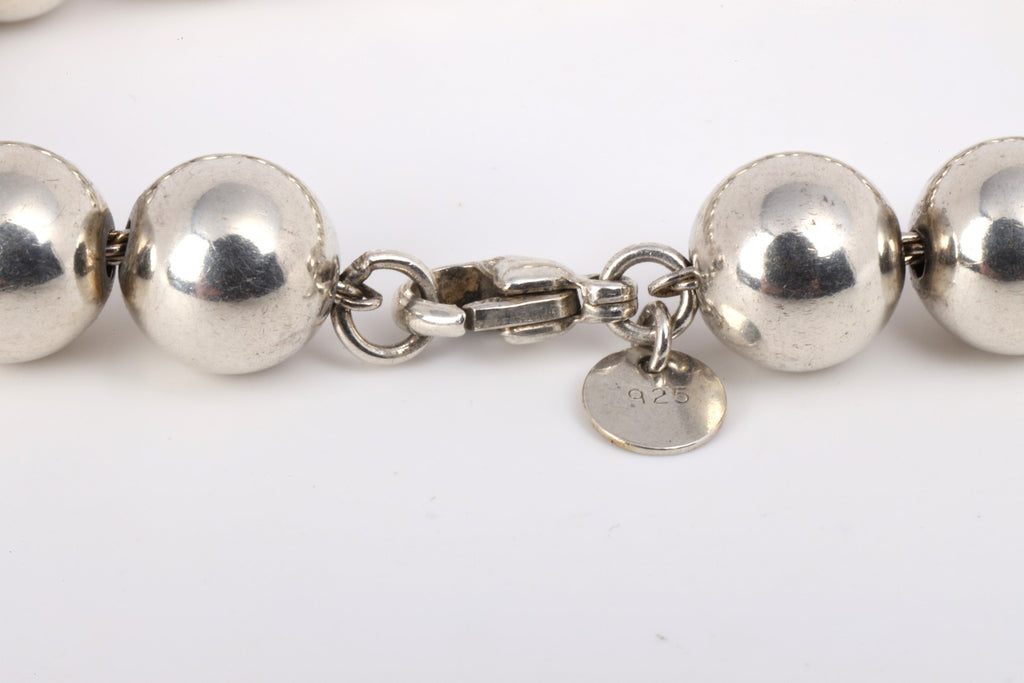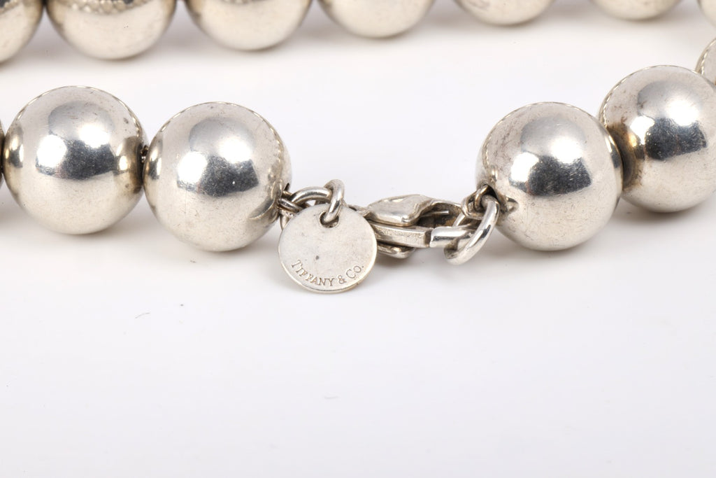 Part of the celebrated HardWear collection by Tiffany & Co., this sterling silver beaded bracelet showcases bold, polished spheres with modern edge and timeless appeal. Measuring 7.5 inches in length and weighing 18.83 grams, it secures with a classic lobster clasp for everyday elegance. Approximate retail: $700.