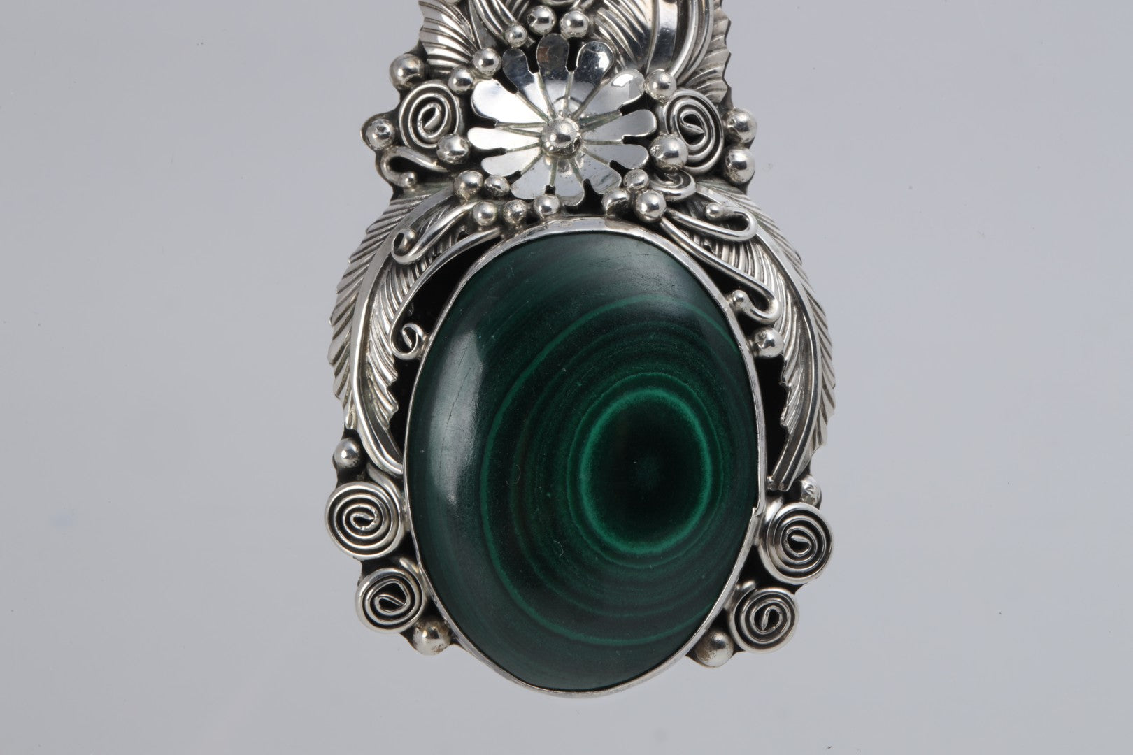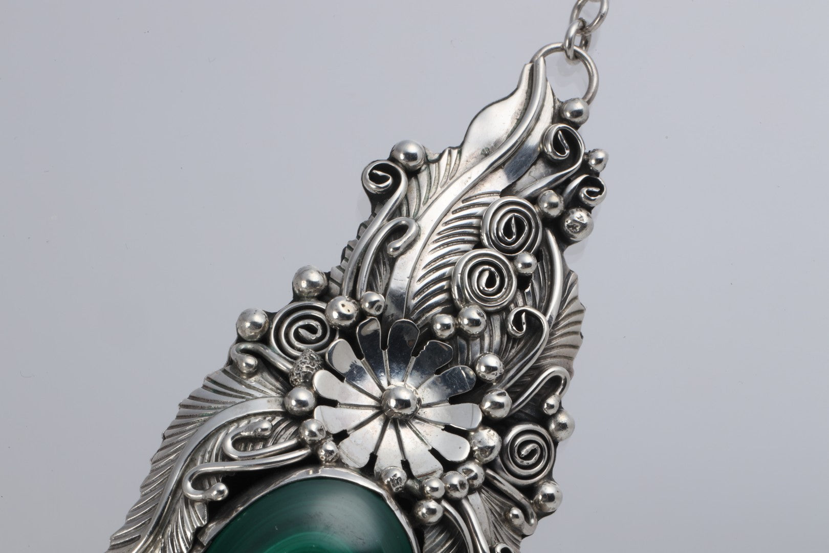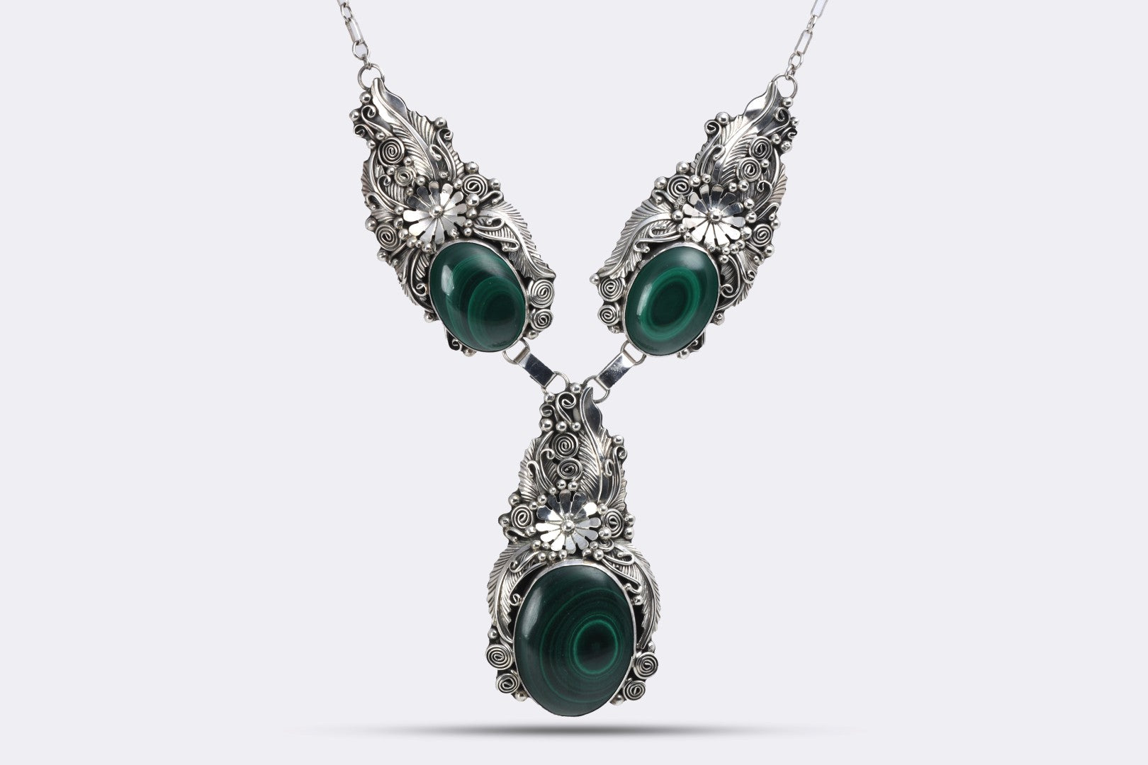 This bold statement necklace features intricate filigree work in sterling silver, beautifully accented with three rich green malachite cabochons. The striking floral pendant design adds elegance and artistry, making this 123.50-gram piece a true showstopper. Perfect for collectors of unique gemstone jewelry or anyone seeking a one-of-a-kind accessory.