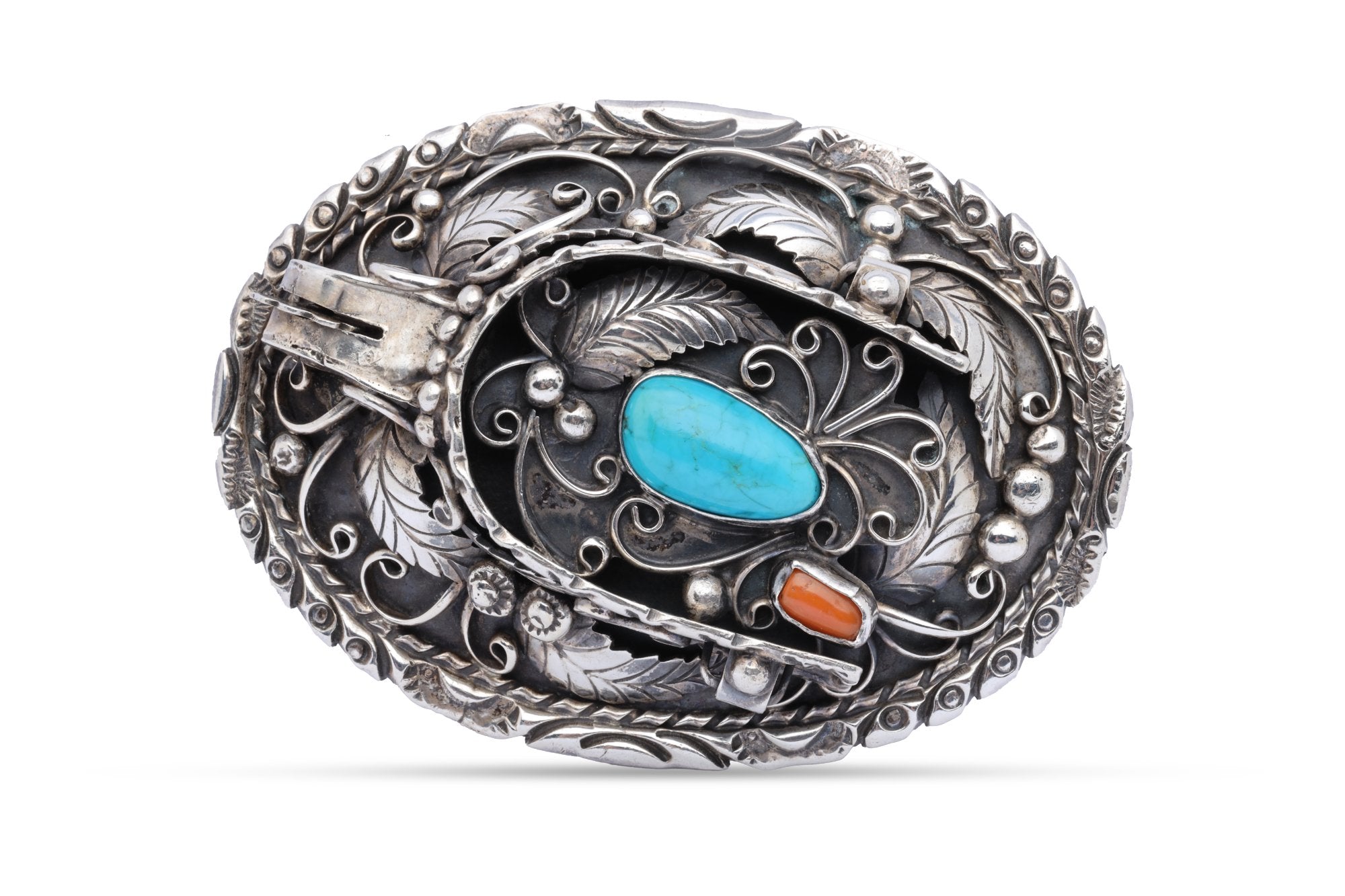 Jerry Roan 925 Silver Turquoise & Coral Navajo Native Spur Buckle (97.30g.)