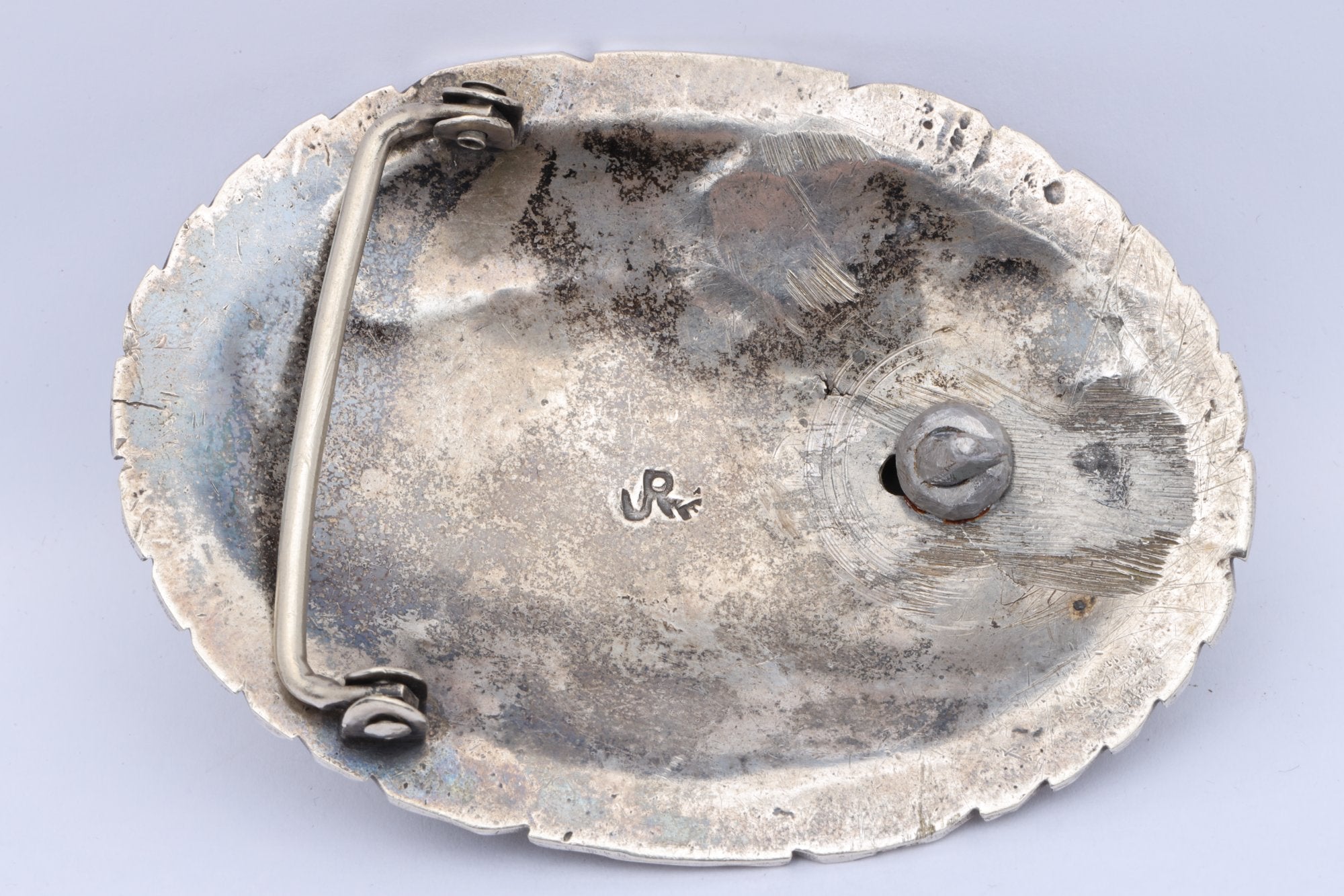 This unique piece by Jerry Roan is a testament to the beauty of Navajo craftsmanship. Made from sterling silver, it features a turquoise and coral spur buckle, adding a touch of color and intrigue to the design.